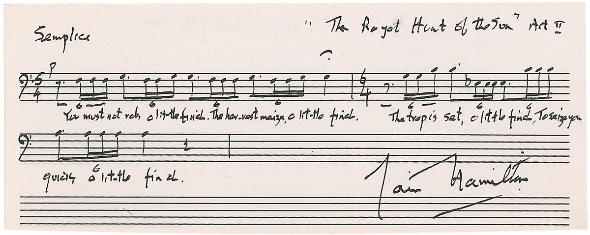 Choice AMQS on an off-white 8.25 x 3.25 musically-lined sheet. Hamilton pens three lengthy bars of music and lyrics which he labels as “‘The Royal Hunt of the Sun,’ Act II,” signing below. In fine condition.