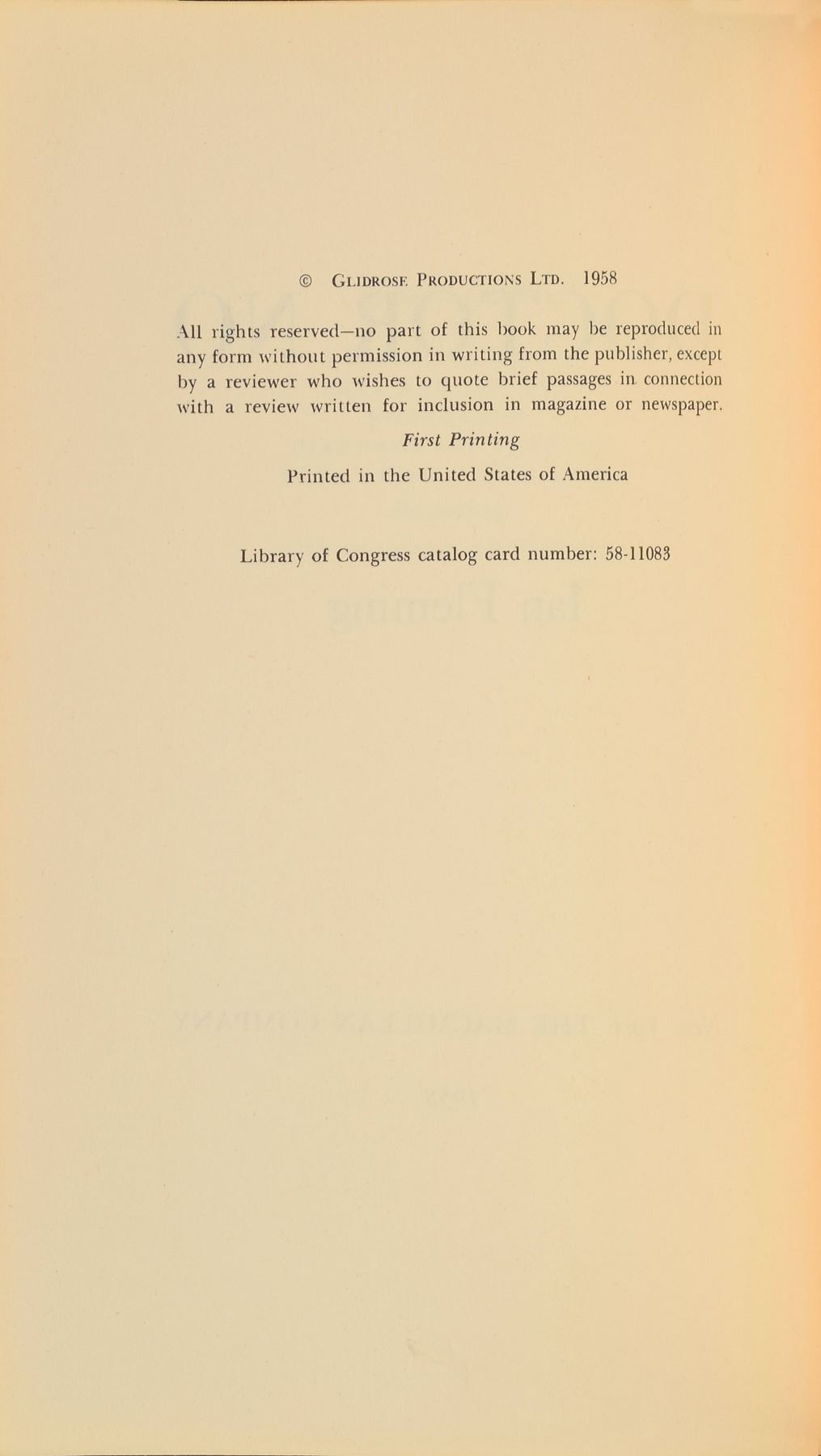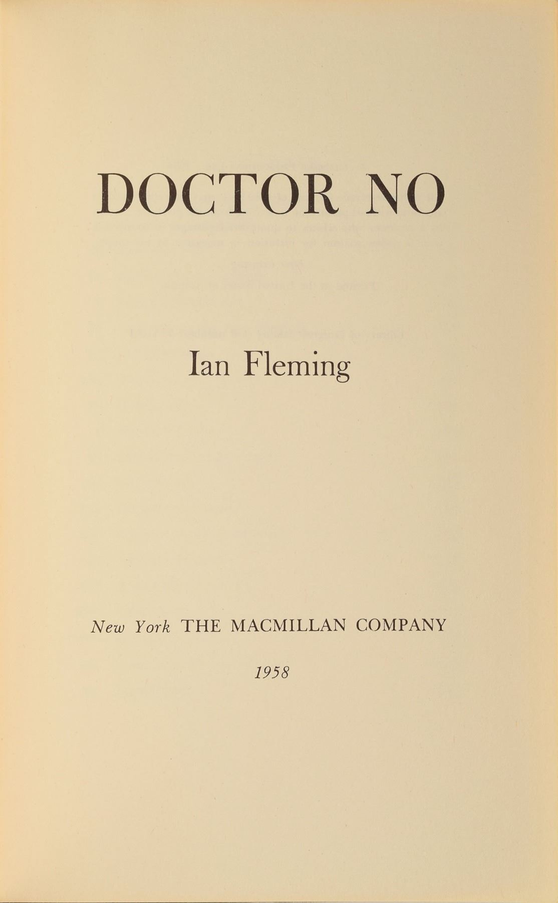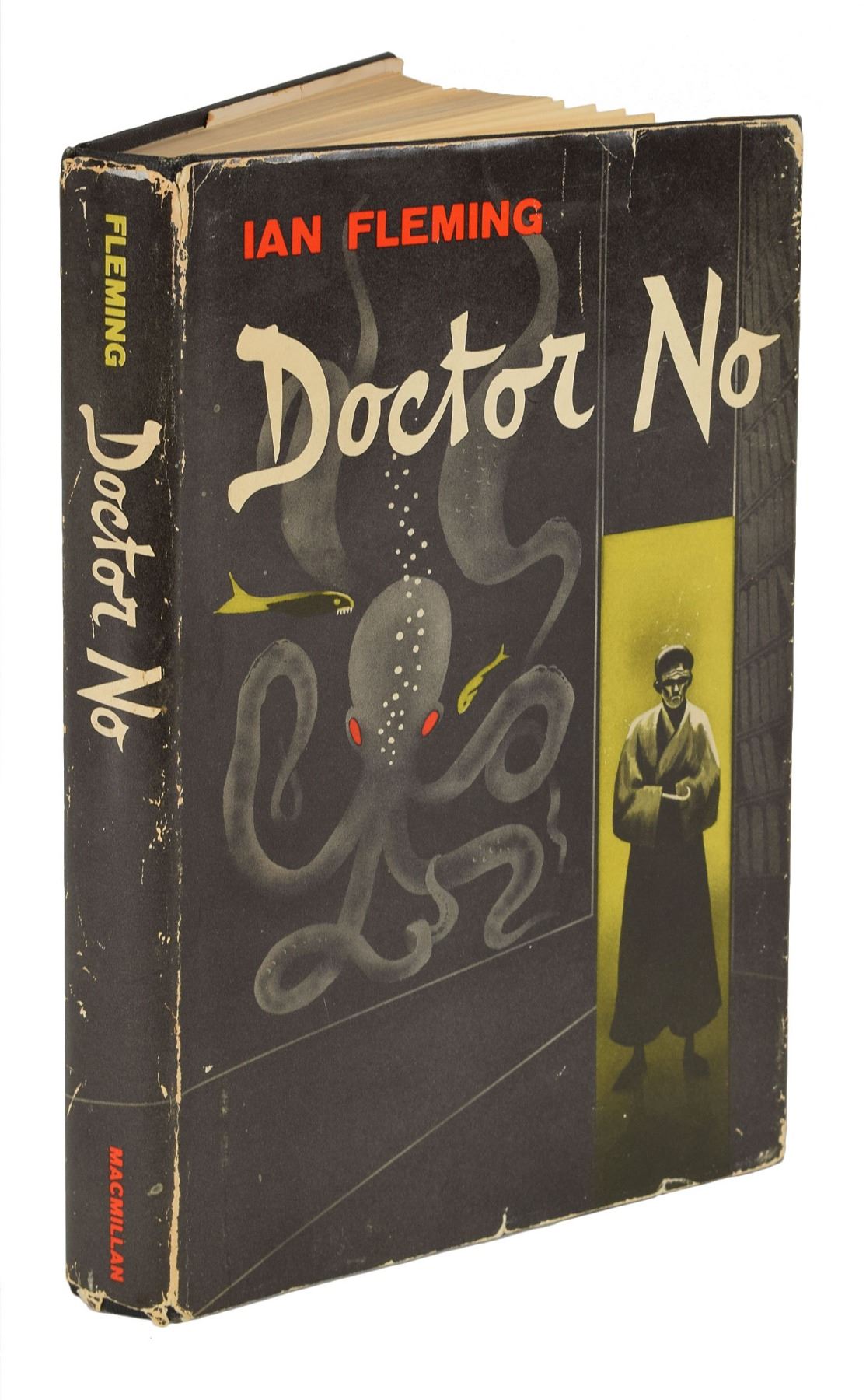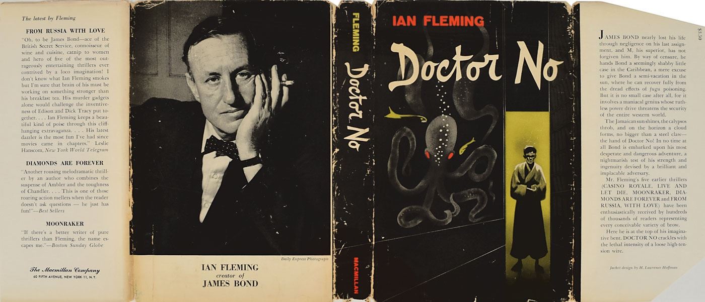 Unsigned book: Doctor No. First American edition, first printing. NY: The Macmillan Company, 1958. Hardcover with dust jacket, 5.75 x 8.5, 256 pages. Book condition: VG+/VG, with wear and a few small edge tears to the dust jacket, and clipped corners to the front flap. The sixth entry into Fleming's James Bond series, Dr. No centers on Bond's investigation into the disappearance of two fellow MI6 operatives in Jamaica.