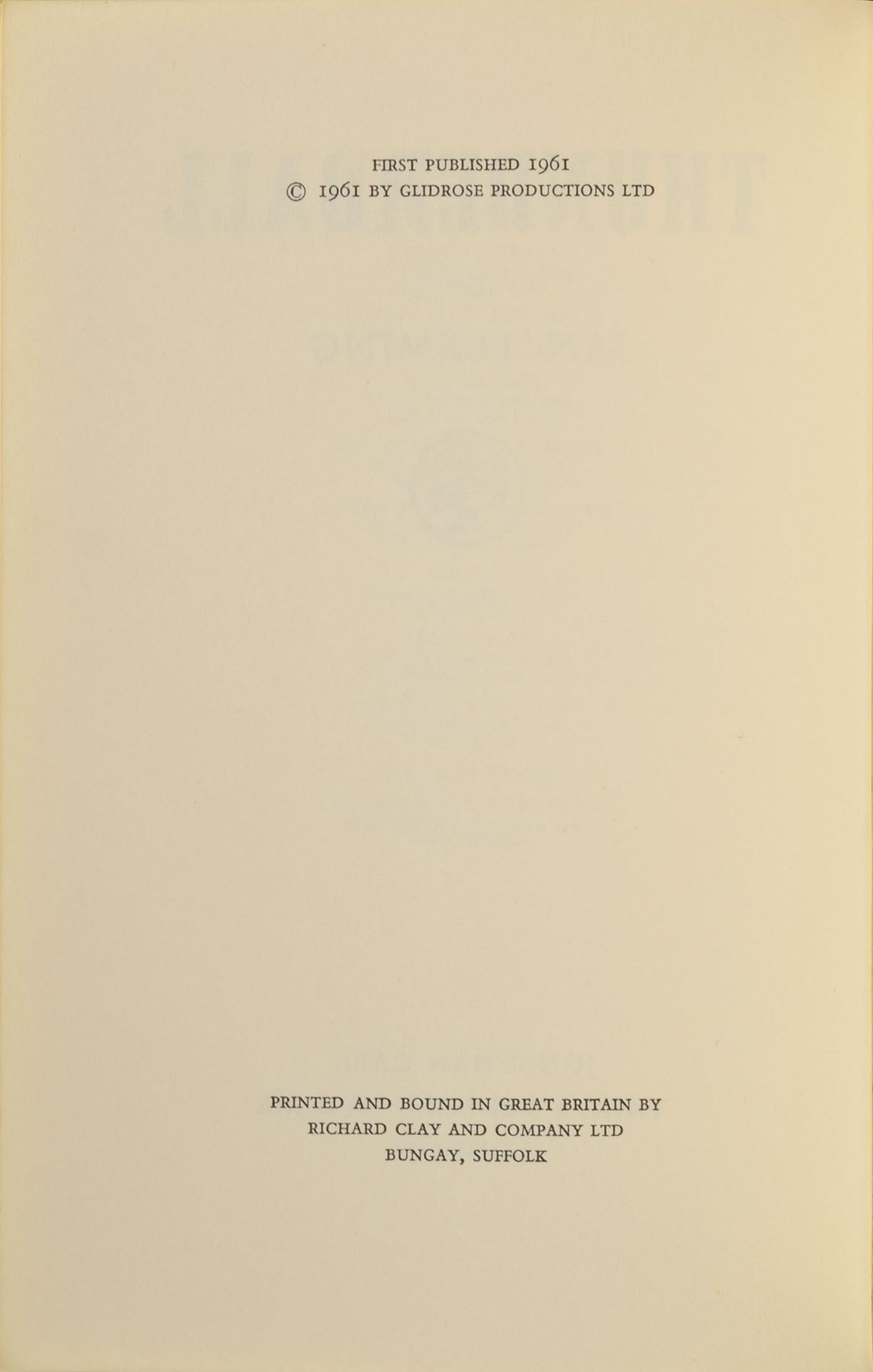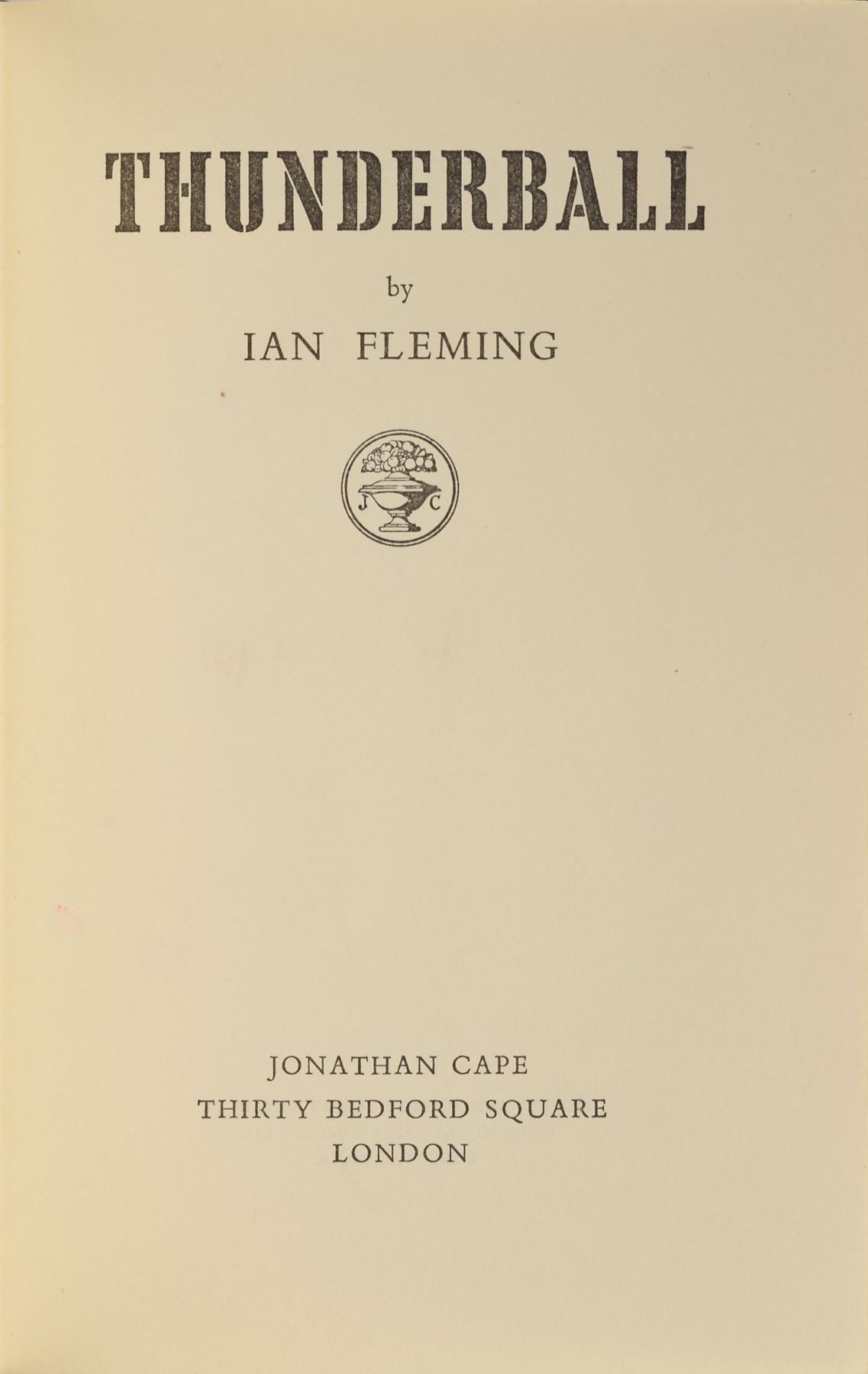 Unsigned book: Thunderball. First edition, first printing. London: Jonathan Cape, 1961. Hardcover with dust jacket, 5.25 x 7.75, 254 pages. Book condition: VG+/VG. The eighth James Bond novel, Thunderball centers on the theft of two atomic bombs by the SPECTRE crime syndicate and Bond's efforts to recover them.