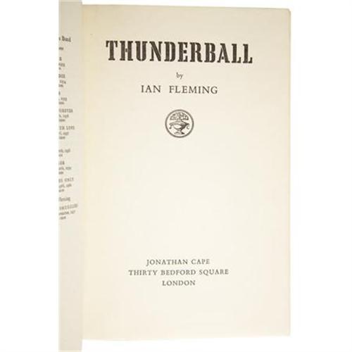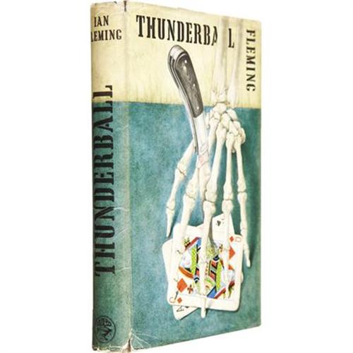 <B>Ian Fleming: </B></I><B><I>Thunderball</B></I></B></I>. (London: Jonathan Cape, 1961), first edition, 254 pages, jacket design by Richard Chopping, black boards with skeletal hand motif in blind on front cover, gilt titles on spine, dust jacket (unclipped), 12mo (5.25” x 7.75”), bumping to head and tail of spine, light shelf wear to top and bottom edges, corners bumped and slightly frayed, text block slightly cocked, some toning to contents with a few small stains, dust jacket with a few rips and tears mostly to the head and tail of the spine and corners, small bookseller sticker attached to lower corner of ffep, else a very good copy in a like jacket.<BR><BR><b>Shipping:</b> Books & Catalogs (<a target="_blank" href="http://www.heritageauctions.com/common/shipping.php">view shipping information</a>)