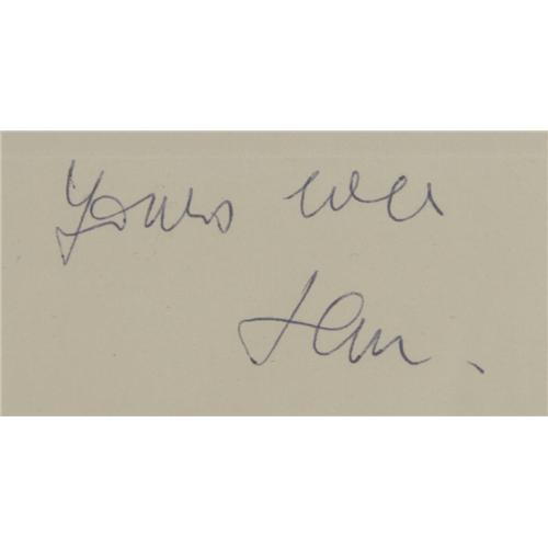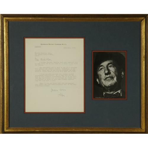 <B>Ian Fleming Typed Letter Signed</B></I> at the close "<I>Yours ever Ian</B></I>". One page, 7.5" x 9.5", Kemsley House letterhead, London, June 30, 1952, to Nicolas Bentley. Fleming who at the time was working for the Kemsley chain of newspapers, writes, in part: "<I>Dear Nicholas</B></I> [sic] I gather from Mr. Neville that your contract with us ends today and he has asked me to write you about the future. The suggestion now is that we pay you a straight five guineas per ordered picture, Sometimes, as at present, there will be six ordered pictures a week while at others there nay be no more than one or two..." Nicolas Bentley was a very popular British author and illustration artist. He is possibly best known for his drawings used to illustrate T. S. Eliot's <I>Old Possum's Book of Practical Cats</B></I> (on which the musical <I>Cats</B></I> is based). It would be the very next year after writing this letter that Fleming would publish his first James Bond book <I>Casino Royale</B></I>". This letter, in very fine condition, is double matted with a Horst Tappe photo and framed to an overall size of 19.5" x 15.5".