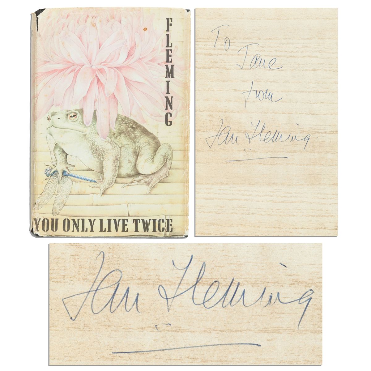Ian Fleming signed first edition of ''You Only Live Twice'', published by Jonathan Cape: London: 1964. Fleming's autograph inscription appears on the front free endpaper, ''To Jane From Ian Fleming''. Second printing of Fleming's eleventh James Bond novel runs 256pp. Bound in black cloth boards with silver lettering. Measures 5.25'' x 7.5''. Light soiling and wear to boards and cocking to spine. Very good overall. Dustjacket shows toning, some paper loss to the spine ends and corners, with a few small spots to panels and remnants of tape repairs to verso. Very good. Housed in a black slipcase.
