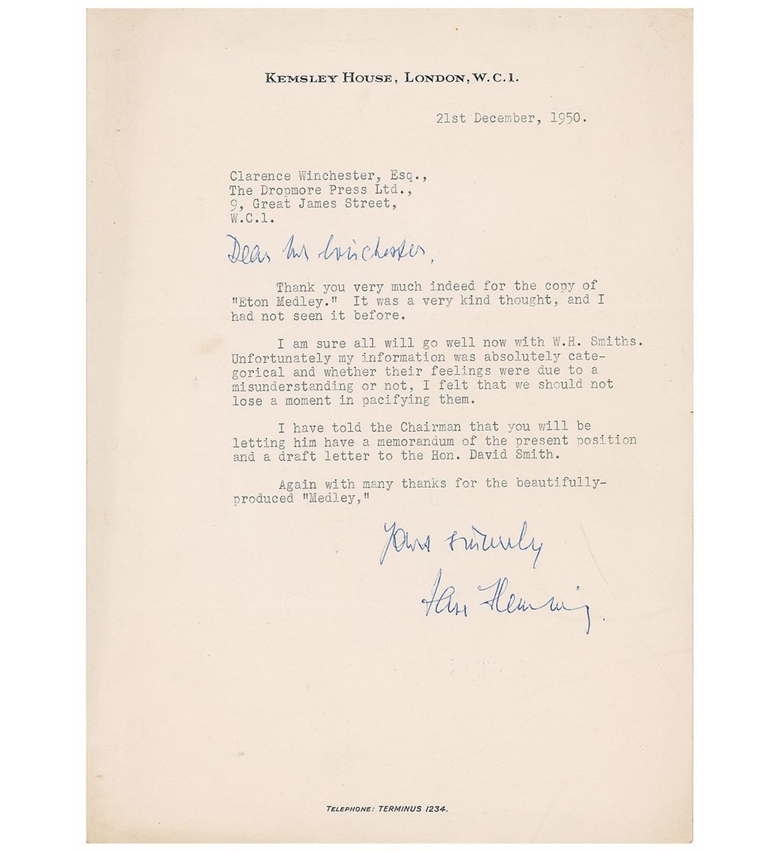 Former British intelligence officer (1908–1964) whose novels featuring suave spy James Bond have attained unprecedented and seemingly indestructible popularity in more than twenty film adaptations over the course of five decades. TLS signed “Yours sincerely, Ian Fleming,” one page, 8 x 10, Kemsley House letterhead, December 21, 1950. Letter to Clarence Winchester at The Dropmore Press Ltd. In full: “Thank you very much indeed for the copy of ‘Eton Medley.’ It was a very kind thought, and I had not seen it before. I am sure all will go well now with W. H. Smiths. Unfortunately my information was absolutely categorical and whether their feelings were due to a misunderstanding or not, I felt that we should not lose a moment in pacifying them. I have told the Chairman that you will be letting him have a memorandum of the present position and a draft letter to the Hon. David Smith. Again with many thanks for the beautifully produced ‘Medley.’” Fleming has also handwritten the greeting at the top of the letter. Some scattered creases and wrinkles, and some mild toning, mainly to the edges, otherwise fine condition.