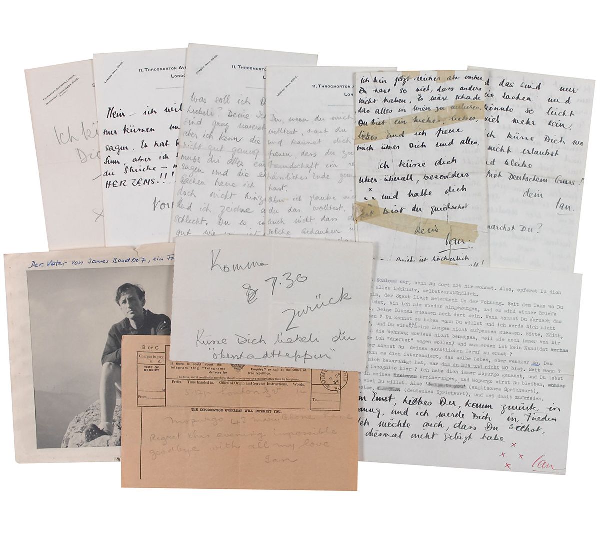 (6) ANS in German, signed “Ian,” 4.5 x 7. In full (translated): “Mine—I only want to kiss you and say nothing. It does not make sense, but I am sending you the pieces of my HEART!!!! Curtain! Ian” With the original envelope, 5 x 3.75, addressed by Fleming in German: “Love letter to my dearest Zazilie.” He’s drawn a “stamp” in the upper right corner resembling a German eagle. Torn open at top.