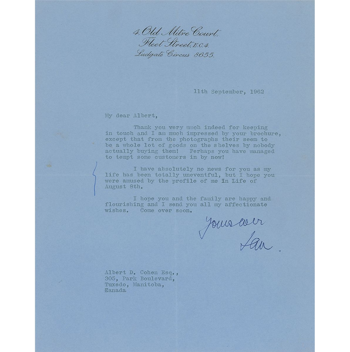 Former British intelligence officer (1908–1964) whose novels featuring suave spy James Bond have attained unprecedented and seemingly indestructible popularity in more than twenty film adaptations over the course of four decades. TLS signed “Yours ever, Ian,” one page, 8 x 10, personal letterhead, September 11, 1962. Letter to Albert Cohen, in part: “Thank you very much indeed for keeping in touch and I am much impressed by your brochure, except that from the photographs their [sic] seem to be a whole lot of goods on the shelves by [sic] nobody actually buying them! Perhaps you have managed to tempt some customers in by now! I have absolutely no news for you as my life has been totally uneventful, but I hope you were amused by the profile of me in Life of August 8th.” In fine condition, with central horizontal and vertical folds, a few light spots of discoloration, and a vertical ink mark next to second paragraph.