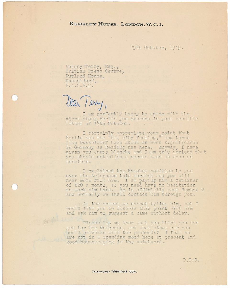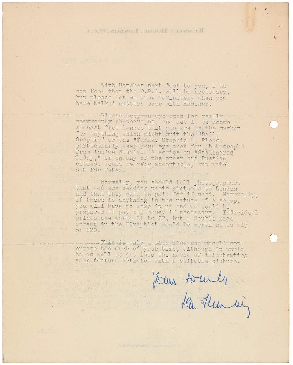 TLS signed “Yours sincerely, Ian Fleming,” one page both sides, 8 x 10, Kemsley House letterhead, October 25, 1949. Letter to journalist and spy Antony Terry of the British Press Centre. In part: “I am perfectly happy to agree with the views about Berlin you express…I certainly appreciate your point that Berlin has the ‘big city feeling,’ and towns like Dusseldorf have about as much significance in Germany as Reading has here. Anyway, I have given you carte blanche and I am only anxious that you should establish a secure base as soon as possible. I explained the Hamsher position to you over the telephone this morning and you will hear more from him. I am paying him a retainer of £20 a month, so you need have no hesitation to work him hard. He is officially your Number 2 and normally we shall contact him through you. At the moment we cannot byline him, but I would like you to discuss this point with him and ask him to suggest a name without delay. Please let me know what you think you can get for the Mercedes, and what other car you could purchase with the proceeds? I fear we are not in a spending mood here at present and good housekeeping is the watchword. With Hamsher next door to you, I do not feel that the D.P.A. will be necessary…Please keep an eye open for really newsworthy photographs, and let it be known amongst free-lances that you are in the market for anything which might suit the ‘Daily Graphic’ or the ‘Sunday Graphic.’ Please particularly keep your eye open for photographs from inside Russia. A series on ‘Stalingrad Today,’ or on any of the other big Russian cities, would be very acceptable, but watch out for fakes. Normally, you should tell photographers that you are sending their pictures to London and that they will be paid for if used. Naturally, if there is anything in the nature of a scoop, you will have to snap it up and we would be prepared to pay big money if necessary. Individual prints are worth £1 to £2, but a double-page spread in the ‘Graphic’ would be worth up to £15 or £20. This is only a side line and should not engage too much of your time, although it would be as well to get into the habit of illustrating your feature articles with a suitable picture.” In fine condition.