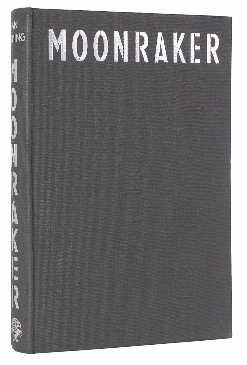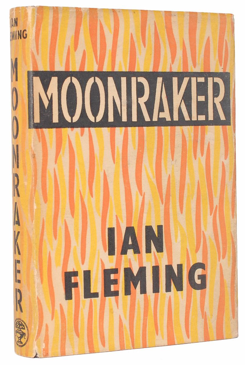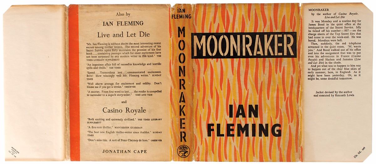 Rare unsigned book: Moonraker. First edition, first printing (with “shoot” on page 10, and a 19 mm text block). London: Jonathan Cape, 1955. Hardcover with dust jacket (priced at 10s 6d), 5.25 x 7.5, 256 pages. Book condition: VG+/VG+. Typically sunned to the point that the flames are indistinguishable, this dust jacket is extremely difficult to find with this level of definition. A fantastic first of this sought-after early title.