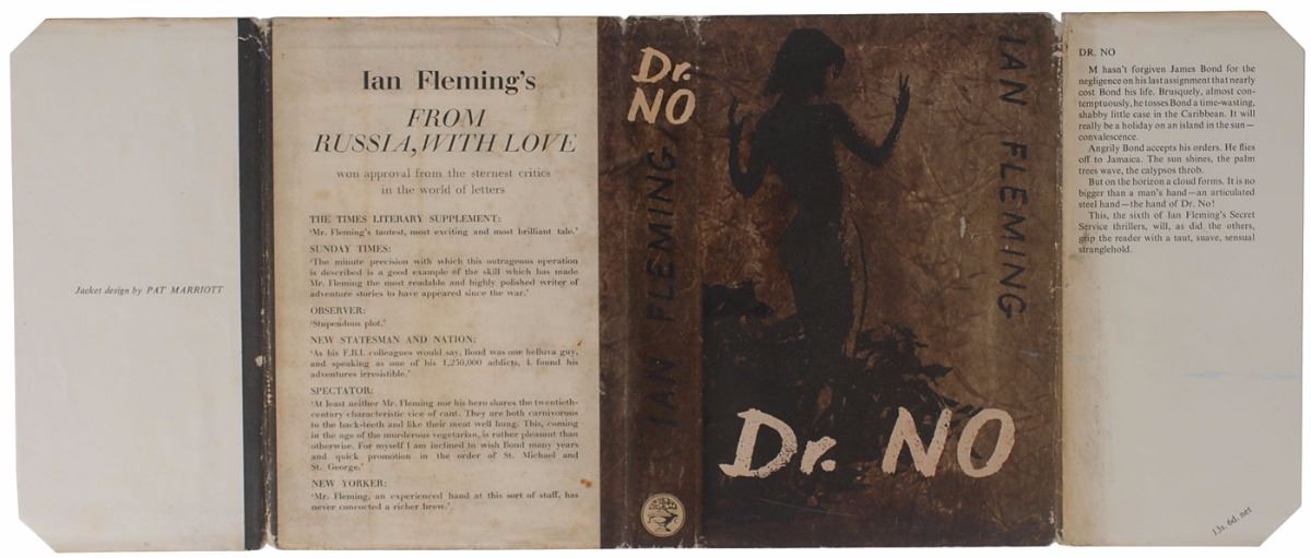 Unsigned book: Dr. No. First edition, first printing. London: Jonathan Cape, 1958. Hardcover with dust jacket (priced at 13s 6d), 5.25 x 7.5, 256 pages. Book condition: VG+/VG-. This is the variant with the ‘dancing girl’ silhouette on the front board.