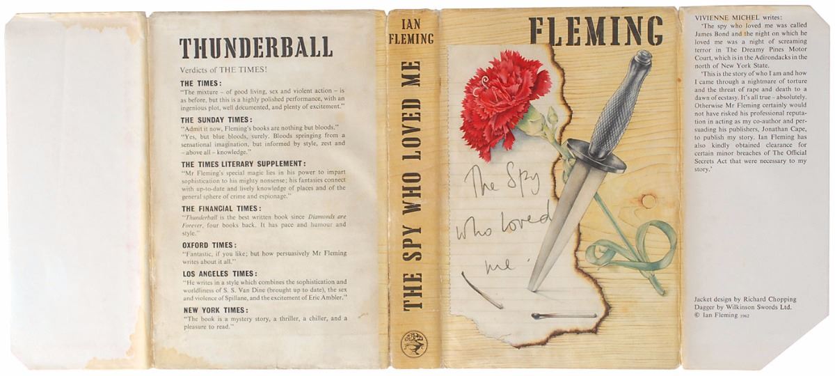 Unsigned book: The Spy Who Loved Me. First edition, first printing (not the quad mark variant). London: Jonathan Cape, 1962. Hardcover with dust jacket (with the blank rear flap), 5.25 x 7.5, 221 pages. Book condition: VG-/VG-.