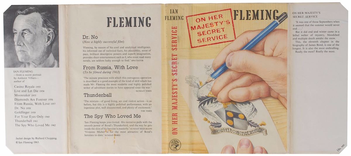 Unsigned book: On Her Majesty’s Secret Service. First edition, first printing. London: Jonathan Cape, 1963. Hardcover with a bright, bold dust jacket (priced at 16s), 5.25 x 7.5, 288 pages. Book condition: VG+/VG+.