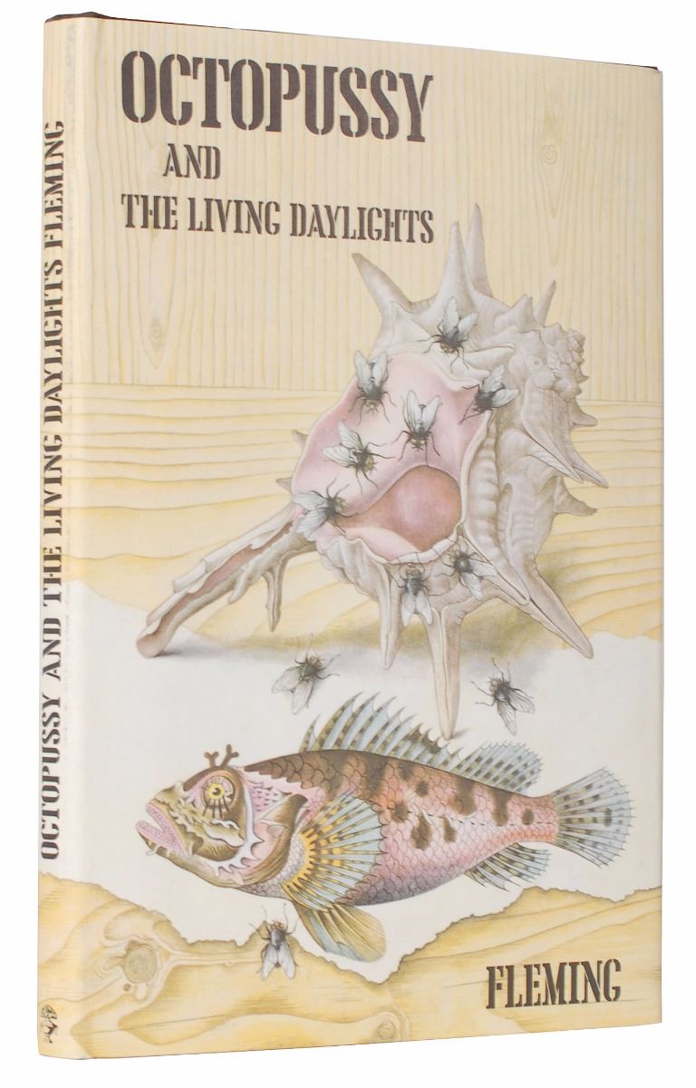 Unsigned book: Octopussy and the Living Daylights. First edition, first printing. London: Jonathan Cape, 1966. Hardcover with dust jacket (with revised 16s price sticker over the original 10s 6d), 5.25 x 7.5, 95 pages. Book condition: NF/VG+.