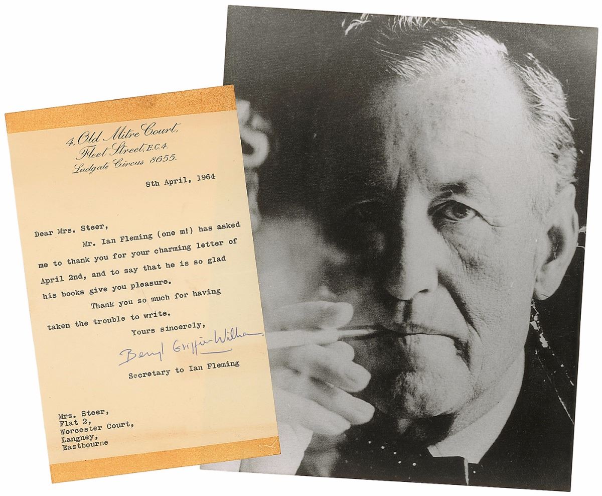 Ballpoint signature, “Ian Fleming,” on an off-white 5 x 3.5 sheet. In fine condition. Accompanied by a 1964 letter from the author’s secretary that reads, in part: “Mr. Ian Fleming (one m!) has asked me to thank you for your charming letter of April 2nd, and to say that he is so glad his books give you pleasure.” Also accompanied by an unsigned glossy photo.