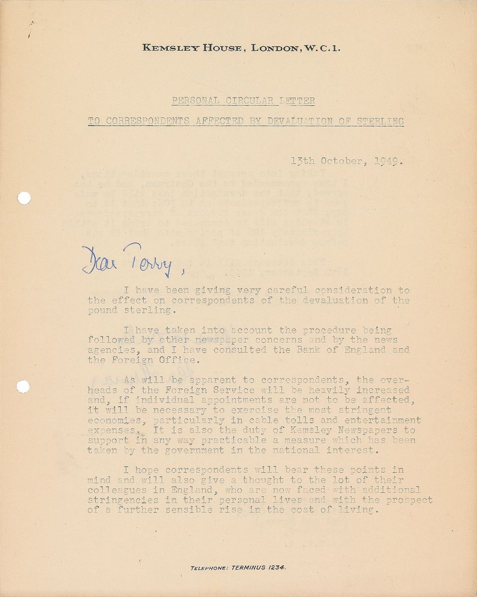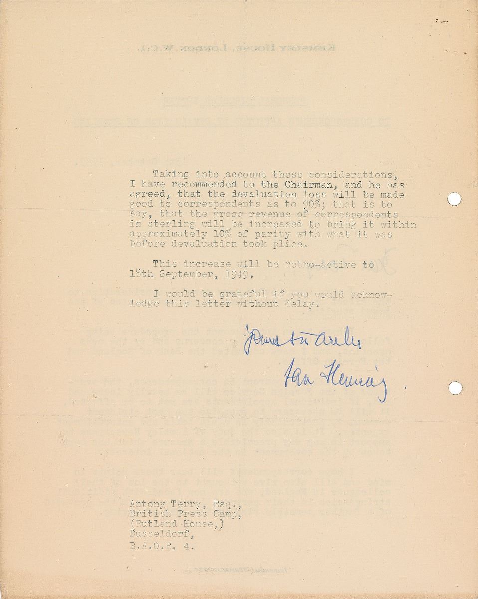 TLS signed “Yours sincerely, Ian Fleming,” one page both sides, 8 x 10, Kemsley House letterhead, October 13, 1949. Letter to journalist and spy Antony Terry at the British Press Camp in Dusseldorf, Germany, headed “Personal Circular Letter to Correspondents Affected by Devaluation of Sterling,” in part: “I have been giving very careful consideration to the effect on correspondents of the devaluation of the pound sterling…It will be necessary to exercise the most stringent economies, particularly in cable tolls and entertainment expenses. It is also the duty of Kemsley Newspapers to support in any way practicable a measure which has been taken by the government in the national interest…I have recommended to the Chairman, and he has agreed, that the devaluation loss will be made good to correspondents as to 90%.” In fine condition.