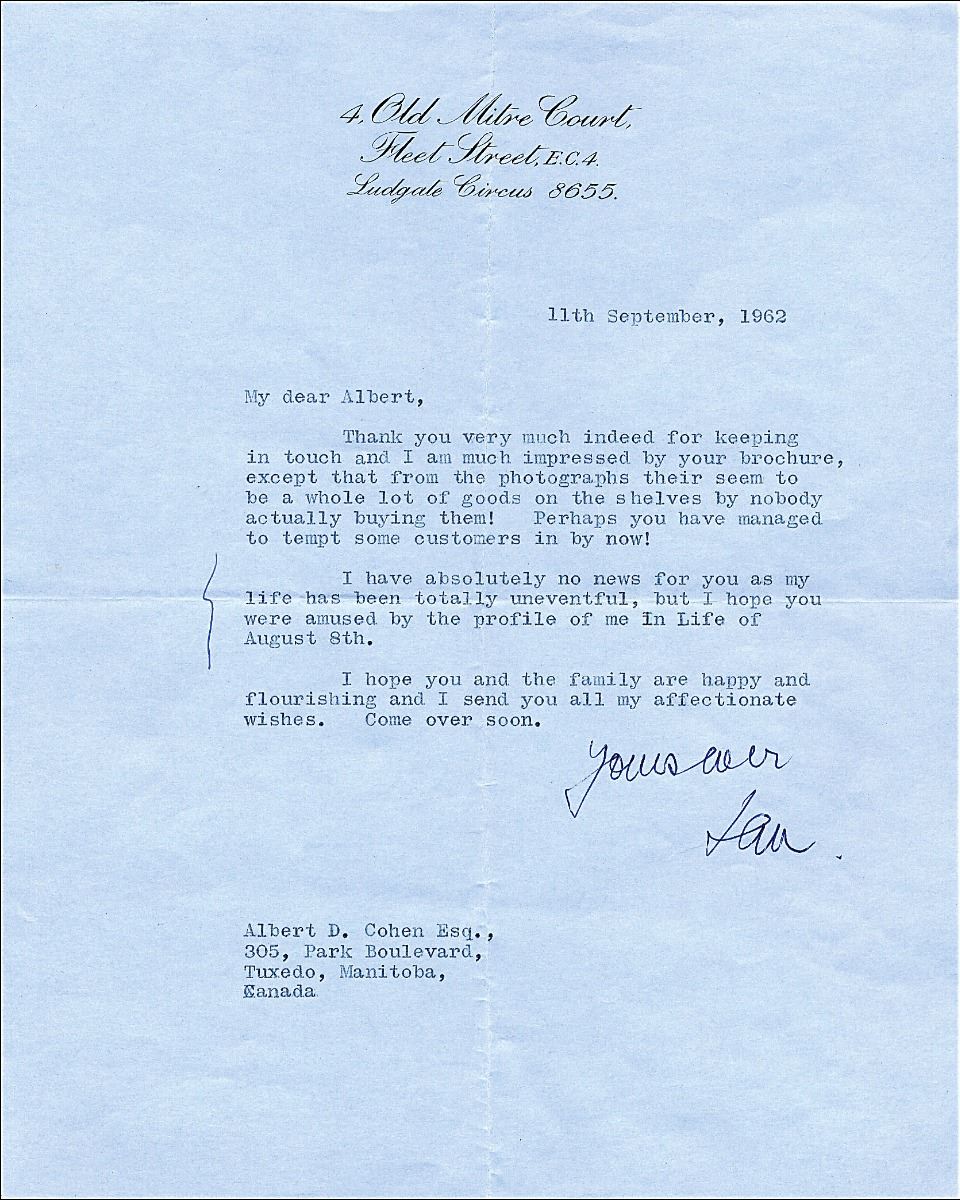 TLS signed “Yours ever, Ian,” one page, 8 x 10, personal letterhead, September 11, 1962. Letter to Albert D. Cohen, in full: “Thank you very much indeed for keeping in touch and I am much impressed by your brochure, except that from photographs their [sic] seem to be a whole lot of goods on the shelves by nobody actually buying them! Perhaps you have managed to tempt some customers in by now! I have absolutely no news for you as my life has been totally uneventful, but I hope you were amused by the profile of me in Life of August 8th. I hope you and the family are happy and flourishing and I send you all my affectionate wishes.” In fine condition.