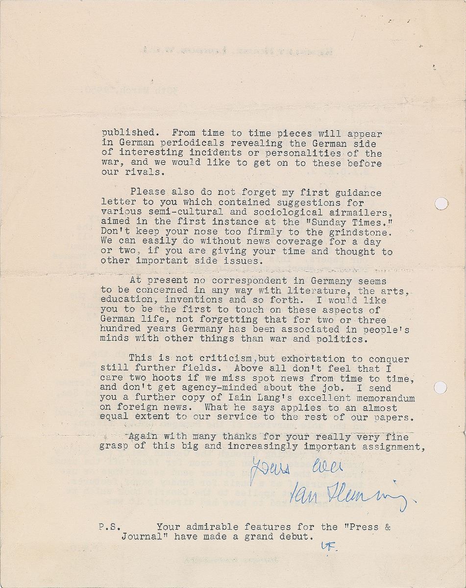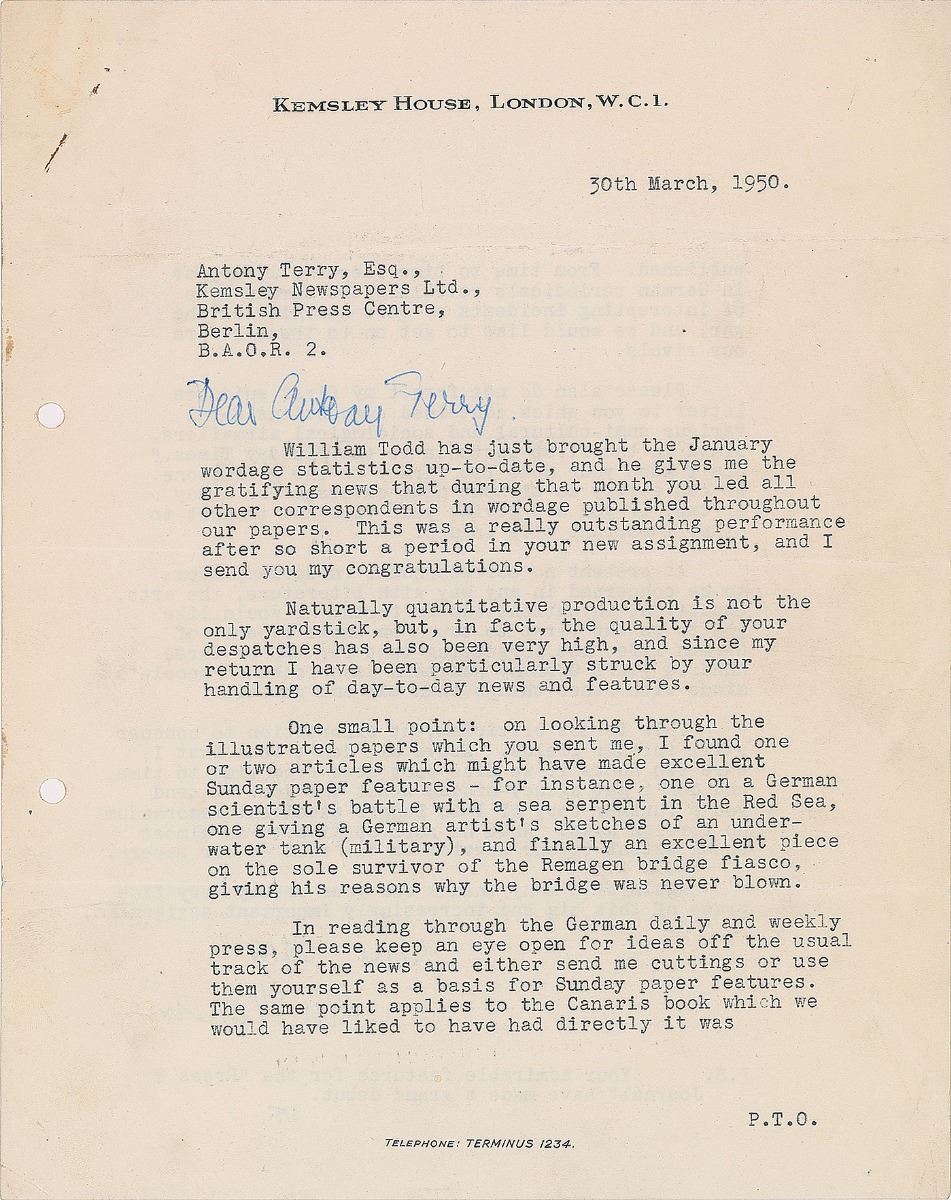 TLS signed “Yours ever, Ian Fleming,” one page both sides, 8 x 10, Kemsley House letterhead, March 30, 1950. Letter to journalist and spy Antony Terry of the British Press Centre, in part: “William Todd has just brought the January wordage statistics up-to-date, and he gives me the gratifying news that during that month you led all other correspondents in wordage published throughout our papers. This was a really outstanding performance after so short a period in your new assignment, and I send you my congratulations…One small point: on looking through the illustrated papers which you sent me, I found one or two articles which might have made excellent Sunday paper features—for instance, one of a German scientist's battle with a sea serpent in the Red Sea, one giving a German artist’s sketches of an underwater tank (military), and finally an excellent piece on the sole survivor of the Reamgen bridge fiasco, giving his reasons why the bridge was never blown…please keep an eye open for ideas off the usual track of the news and either send me cuttings or use them yourself as a basis for Sunday paper features…Please also do not forget my first guidance letter to you which contained suggestions for various semi-cultural and sociological airmailers, aimed in the first instance at the ‘Sunday Times.’ Don’t keep your nose too firmly to the grindstone. We can easily do without news coverage for a day or tow, if you are giving your time and thought to other important side issues. At present no correspondent in Germany seems to be concerned in any way with literature, the arts, education, inventions and so forth. I would like you to be the first to touch on these aspects of German life, not forgetting that for two or three hundred years Germany has been associated in people’s minds with other things than war and politics.” Fleming handwrites the salutation, “Dear Antony terry,” and adds his initials, “IF,” below a typed postscript, “Your admirable features for the ‘Press & Journal’ have made a grand debut.” In fine condition, with some scattered creasing, and a paperclip and rusty pin impression to the upper left corner.
