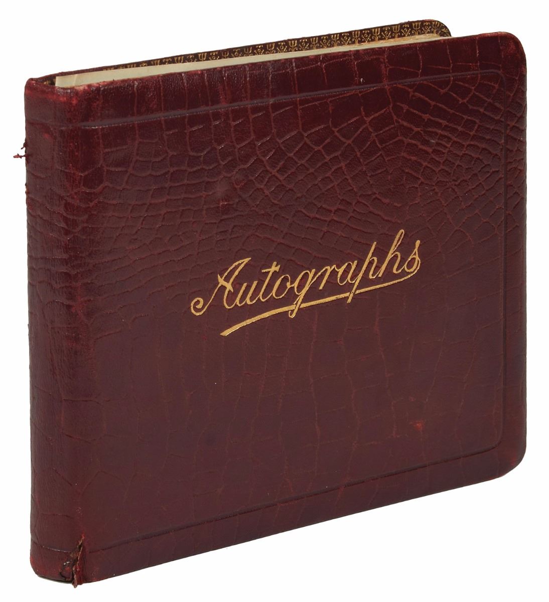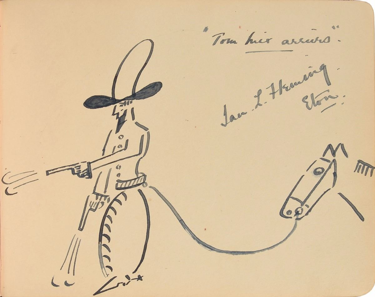 Vintage leather-bound 6.75 x 5.5 autograph album signed inside in black ink, "Ian L. Fleming, Eton," who draws a brilliant original full-length sketch of a pistol-shooting cowboy with a ten-gallon hat and a rope running from his hip to the bit of his horse, and adding above, "'Tom Mix arrives.'" In fine condition. In 1921, a 13-year-old Fleming enrolled at Eton College, an illustrious boarding school where he excelled at sports and edited the school magazine, The Wyvern. His tenure at Eton was cut a term early, however, when his house master E. V. Slater persuaded Fleming’s mother to prepare him for entry to the Royal Military College at Sandhurst in 1927. Given how this sketch was achieved during his formative schooling years, Fleming's portrayal of Mix, Hollywood's first Western superstar, alludes to the author's fascination with the dashing clean-cut hero and a very likely inspiration for his famous James Bond character.