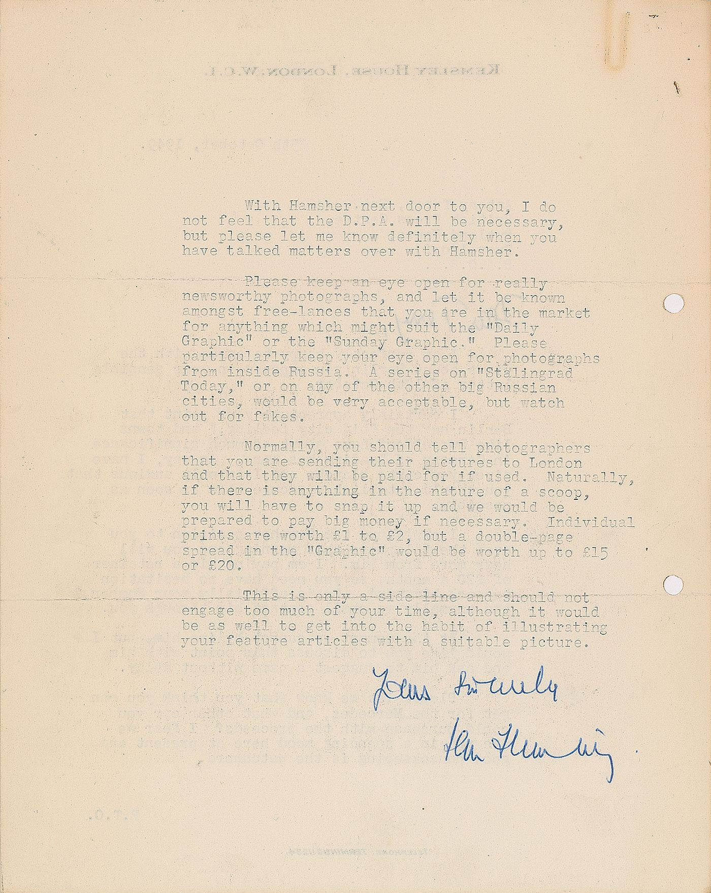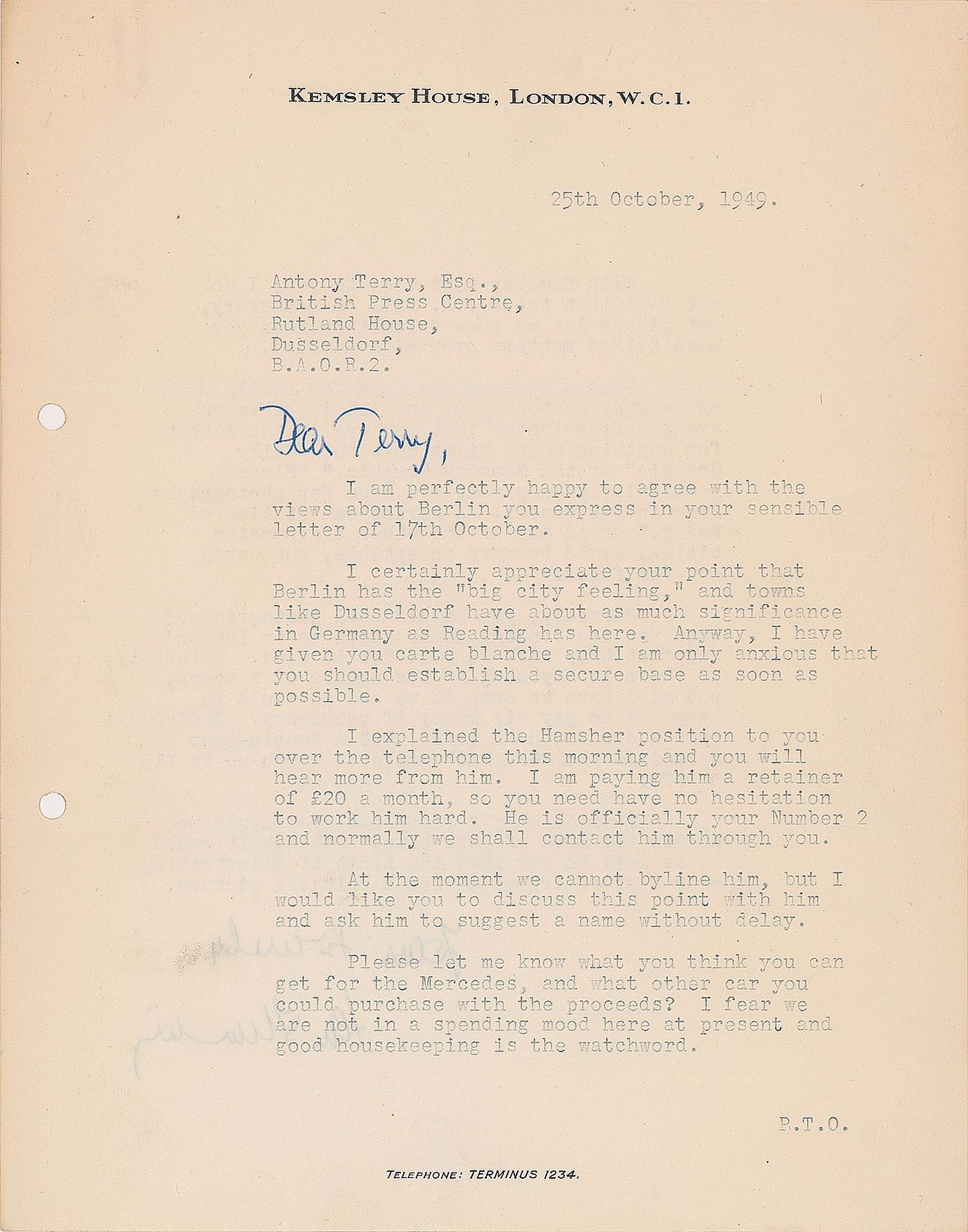 TLS signed “Yours sincerely, Ian Fleming,” one page both sides, 8 x 10, Kemsley House letterhead, October 25, 1949. Letter to journalist and spy Antony Terry of the British Press Centre. In part: “I am perfectly happy to agree with the views about Berlin you express…I certainly appreciate your point that Berlin has the ‘big city feeling,’ and towns like Dusseldorf have about as much significance in Germany as Reading has here. Anyway, I have given you carte blanche and I am only anxious that you should establish a secure base as soon as possible. I explained the Hamsher position to you over the telephone this morning and you will hear more from him. I am paying him a retainer of £20 a month, so you need have no hesitation to work him hard. He is officially your Number 2 and normally we shall contact him through you. At the moment we cannot byline him, but I would like you to discuss this point with him and ask him to suggest a name without delay. Please let me know what you think you can get for the Mercedes, and what other car you could purchase with the proceeds? I fear we are not in a spending mood here at present and good housekeeping is the watchword. With Hamsher next door to you, I do not feel that the D.P.A. will be necessary…Please keep an eye open for really newsworthy photographs, and let it be known amongst free-lances that you are in the market for anything which might suit the ‘Daily Graphic’ or the ‘Sunday Graphic.’ Please particularly keep your eye open for photographs from inside Russia. A series on ‘Stalingrad Today,’ or on any of the other big Russian cities, would be very acceptable, but watch out for fakes. Normally, you should tell photographers that you are sending their pictures to London and that they will be paid for if used. Naturally, if there is anything in the nature of a scoop, you will have to snap it up and we would be prepared to pay big money if necessary. Individual prints are worth £1 to £2, but a double-page spread in the ‘Graphic’ would be worth up to £15 or £20. This is only a side line and should not engage too much of your time, although it would be as well to get into the habit of illustrating your feature articles with a suitable picture.” In fine condition.