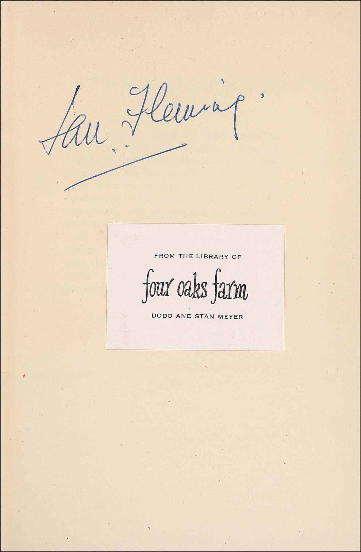 Signed book: The Diamond Smugglers. Later printing. London: Jonathan Cape, 1957. Hardcover with dustjacket, 5.5 x 8, 160 pages. Signed on the first free end page in ballpoint by Fleming. In fine condition, with an ownership bookplate in the center of the signed page. The dustjacket shows light expected wear, with the spine sunned and chipped at its top.