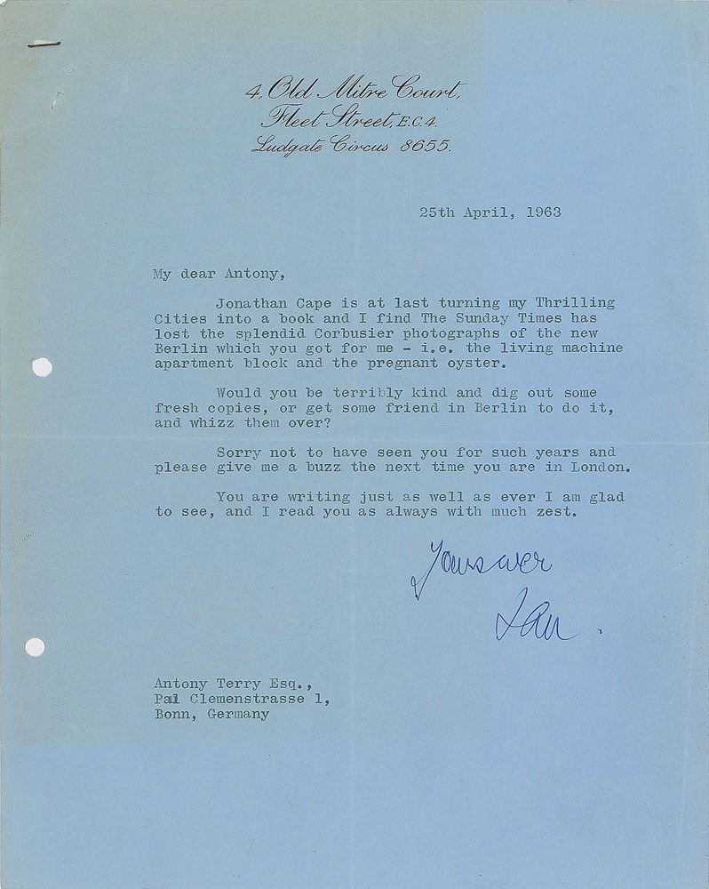 TLS signed “Yours ever, Ian.,” one page, 8 x 10, 4, Old Mitre Court, Fleet Street letterhead, April 25, 1963. Letter to journalist and spy Antony Terry in Bonn, Germany, in full: "Jonathan Cape is at last turning my Thrilling Cities into a book and I find The Sunday Times has lost the splendid Corbusier photographs of the new Berlin which you got for me—i.e. the living machine apartment block and the pregnant oyster. Would you be terribly kind and dig out some fresh copies, or get some friend in Berlin to do it, and whizz them over? Sorry not to have seen you for such years and please give me a buzz the next time you are in London. You are writing just as well as ever I am glad to see, and I read you as always with much zest." In very good to fine condition, with light creasing, staple holes to the upper left, and two filing holes along the left edge. While working as foreign manager of the Kemsley newspaper group's Sunday Times, Fleming hired Terry to be posted in Germany. Utilizing this legitimate news organization as a cover, Fleming also ran an intelligence outfit known as Mercury which used foreign correspondents to gather information in sensitive foreign zones—Terry was one such correspondent. In this particular letter, written well into his days as a successful spy novelist, Fleming references his travelogue Thrilling Cities, published in November 1963, as well as the 'pregnant oyster' building in Berlin.