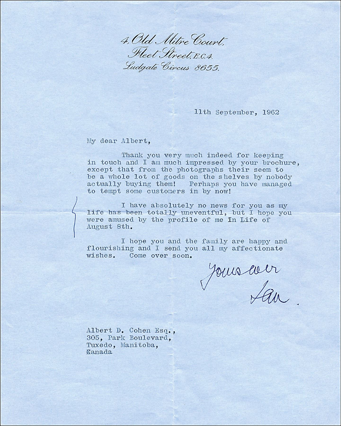 TLS signed “Yours ever, Ian,” one page, 8 x 10, personal letterhead, September 11, 1962. Letter to Albert D. Cohen, in full: “Thank you very much indeed for keeping in touch and I am much impressed by your brochure, except that from photographs their [sic] seem to be a whole lot of goods on the shelves but nobody actually buying them! Perhaps you have managed to tempt some customers in by now! I have absolutely no news for you as my life has been totally uneventful, but I hope you were amused by the profile of me in Life of August 8th. I hope you and the family are happy and flourishing and I send you all my affectionate wishes. Come over soon” In fine condition.