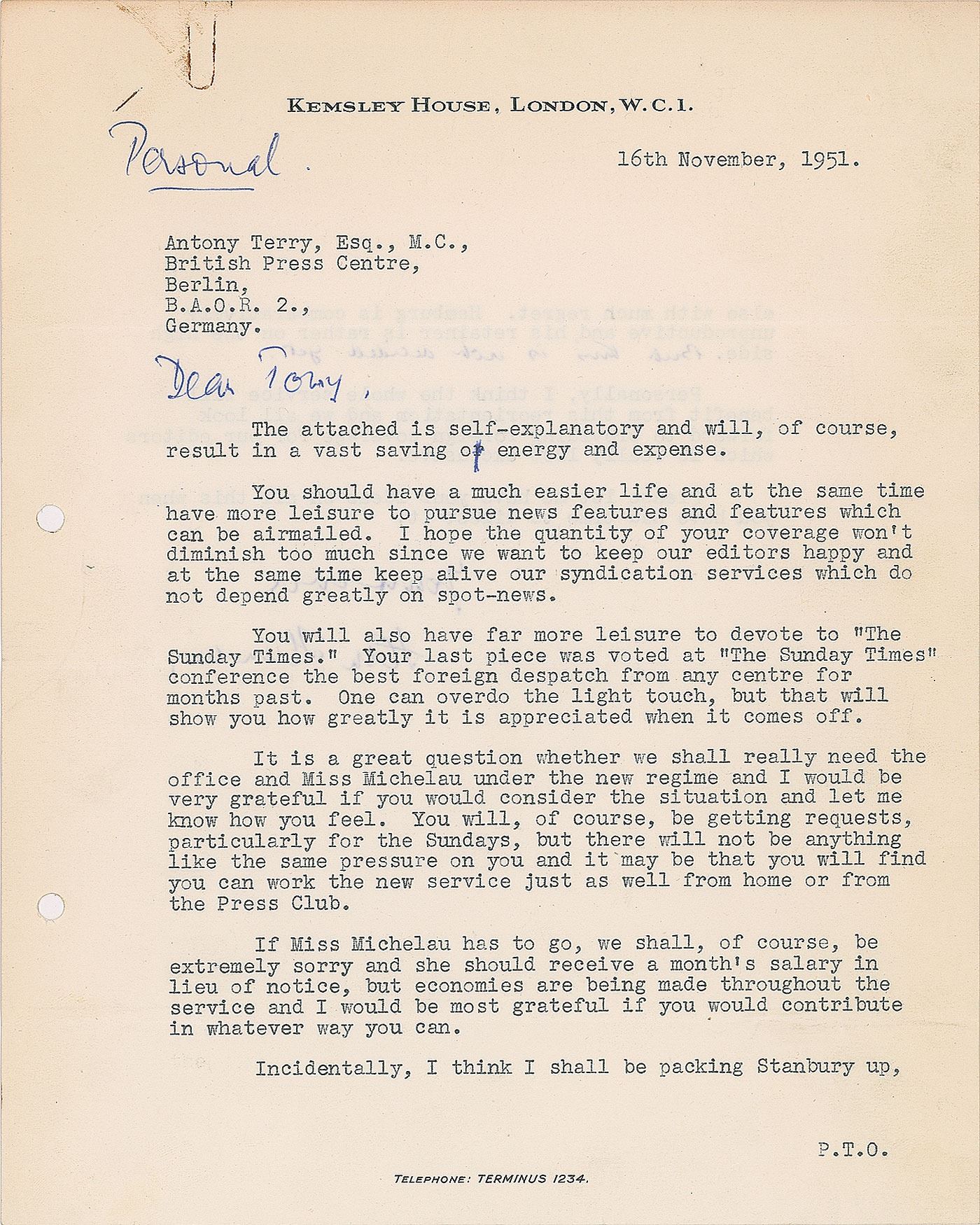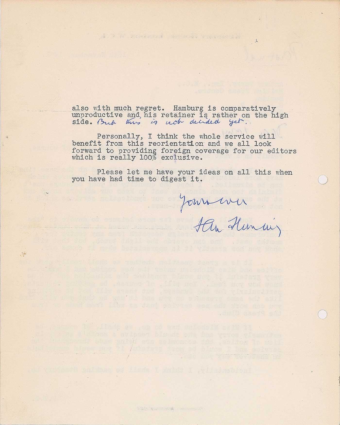 TLS signed “Yours ever, Ian Fleming,” one page both sides, 8 x 10, Kemsley House letterhead, November 16, 1951. Letter to journalist and spy Antony Terry, in part: "The attached is self-explanatory and will, of course, result in a vast saving of energy and expense. You should have a much easier life and at the same time have more leisure to pursue news features and features which can be airmailed. I hope the quantity of your coverage won't diminish too much since we want to keep our editors happy and at the same time keep alive our syndication services which do not depend greatly on spot-news. You will also have far more leisure to devote to 'The Sunday Times.' Your last piece was voted at 'The Sunday Times' conference the best foreign despatch from any centre for months past. It is a great question whether we shall really need the office and Miss Michelau under the new regime…Incidentally, I think I shall be packing Stanbury up, also with much regret. Hamburg is comparatively unproductive and his retainer is rather on the high side. [Fleming handwrites: But this is not decided yet]. Personally, I think the whole service will benefit from this reorientation and we all look forward to providing foreign coverage for our editors which is really 100% exclusive." In fine condition, with two file holes, three horizontal folds, and a rusty paperclip impression to the top edge. Accompanied by a five-page carbon copy report sent to Felming by Terry, containing details on expenditures and potential cost-cutting measures. While working as foreign manager of the Kemsley newspaper group's Sunday Times, Fleming hired Terry to be posted in Germany. Utilizing this legitimate news organization as a cover, Fleming also ran an intelligence outfit known as Mercury which used foreign correspondents to gather information in sensitive foreign zones—Terry was one such correspondent.