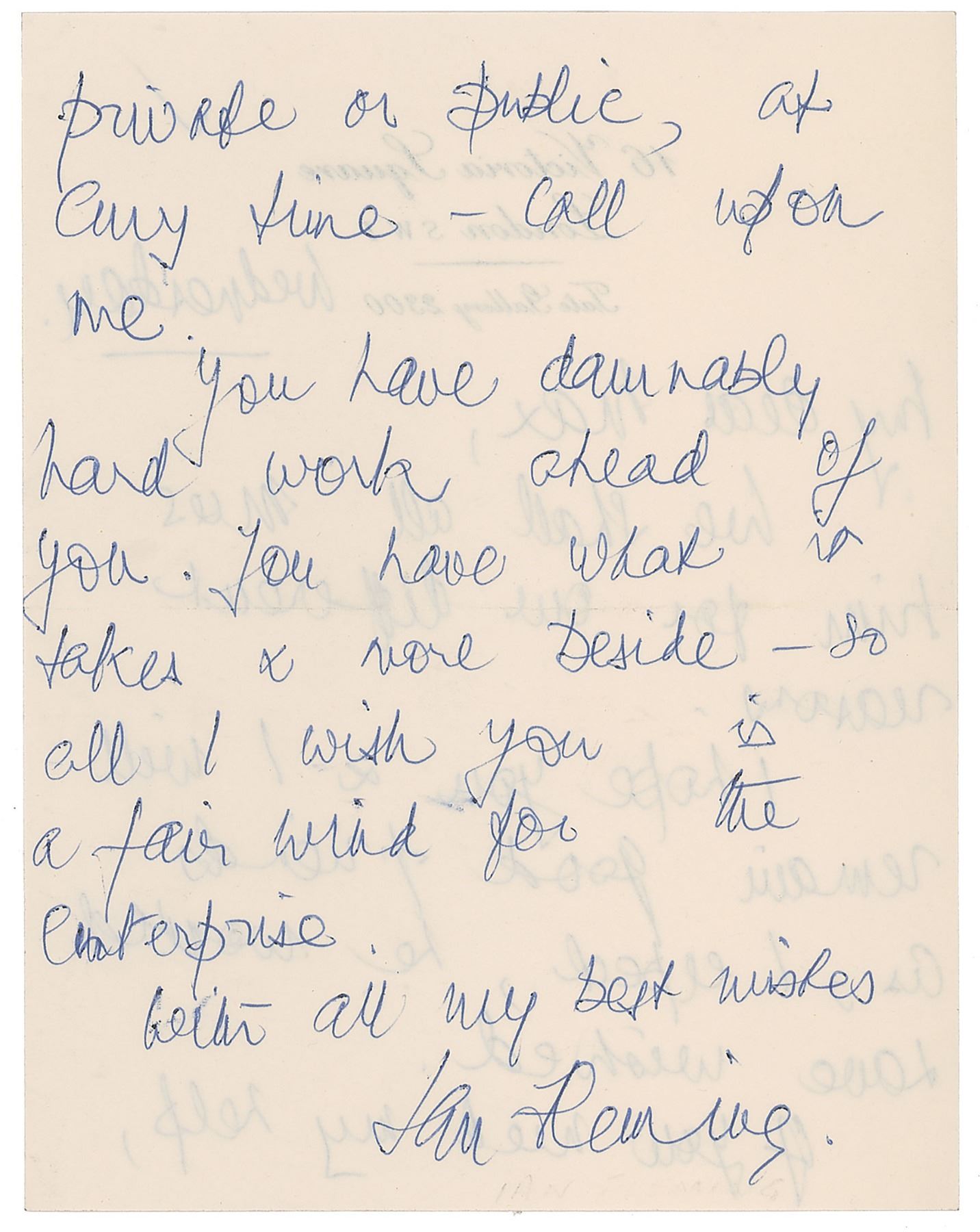 ALS, one page both sides, 5.5 x 7, personal letterhead, no date but circa June 1964. Letter to Max, the son of British-Canadian politician and business tycoon Lord Beaverbrook, who died on June 9, 1964. In part: "We shall all miss him for our different reasons. I hope you & I will remain good friends as, I expect, he would have wished. If you need my help, private or public, at any time—call upon me. You have damnably hard work ahead of you. You have what it takes & more beside—so all I wish you is a fair wind for the enterprise." In fine condition.