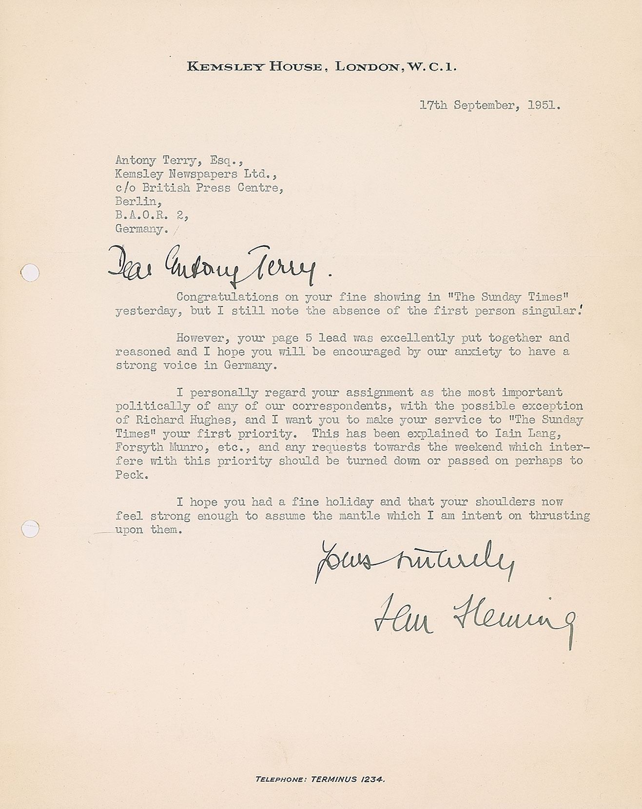 TLS signed “Yours sincerely, Ian Fleming,” one page, 8 x 10, Kemsley House letterhead, September 17, 1951. Letter to journalist and spy Antony Terry of the British Press Centre, in full: "Congratulations on your fine showing in 'The Sunday Times' yesterday, but I still note the absence of the first person singular! However, your page 5 lead was excellently put together and reasoned and I hope you will be encouraged by our anxiety to have a strong voice in Germany. I personally regard your assignment as the most important politically of any of our correspondents, with the possible exception of Richard Hughes, and I want you to make your service to 'The Sunday Times' your first priority. This has been explained to Iain Lang, Forsyth Munro, etc., and any requests towards the weekend which interfere with this priority should be turned down or passed on perhaps to Peck. I hope you had a fine holiday and that your shoulders now feel strong enough to assume the mantle which I am intent on thrusting upon them." Fleming handwrites the salutation, “Dear Antony Terry." In very good to fine condition, with an extra horizontal fold, and two file holes to the left edge.