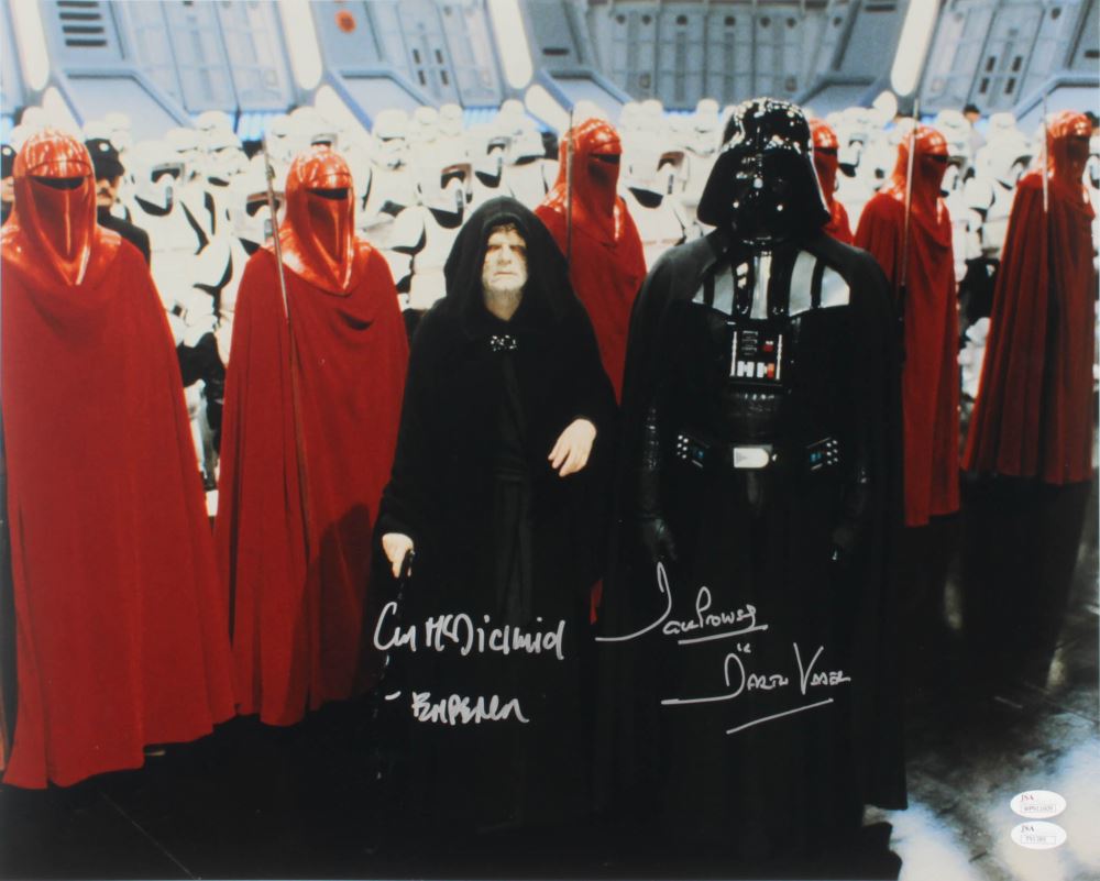 Photo measures 16" x 20" in size and has been hand-signed in silver paint pen by Ian McDiarmid (Emperor Palpatine) and David Prowse (Darth Vader).