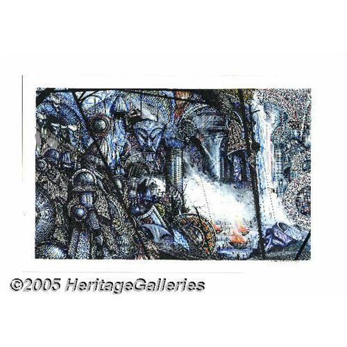 <B>Ian Miller - A Tolkien Bestiary, pages 100 and 101 Original Art (Mitchell Beazley, 1979).</B></I> Since its publication, writer David Day's " "<B>A Tolkien Bestiary</B></I> has sold more than 350,000 copies in nine languages. This lavishly illustrated book on myth and fantasy lore, includes tales of the castles of Middle Earth. This double page illustration, exquisitely illustrated in pen and ink and watercolor by Ian Miller, filled pages 100 and 101. The image area measures 15"" x 9.5"" and the condition of the work is Excellent. Signed by Ian Miller at the bottom right. <BR><BR><B>Important notice:</B> Heritage usually auctions material at the rate of 200-250 lots per hour. On some occasions eBay Live bid software or the Internet may not be able to keep up with the pace of the auction. We recommend placing a realistic absentee bid now as insurance to avoid disappointment. Occasionally the auctioneer may eliminate or reject an eBay Live bid, and the auctioneer may also reopen a lot after the close of the eBay live bidding (usually because we missed an audience bid), and may reject your bid even if it shows you as the winning bidder. By bidding via eBay Live, you agree that Heritage may award the lot to another bidder at its sole discretion under the circumstances described above or any other reasonable circumstances. Since eBay bids are not shown to us until we open the lot on the floor, we treat those bids just like floor bids. In most cases the floor responds before the eBay bid is presented to us, due to Internet lag time, so for consistency we have made it a policy that floor bids are always considered first over tie eBay live bids. Also please note that all Heritage lots purchased through eBay Live carry a 20% Buyer's Premium. Please make sure you read the Terms and Conditions before you bid. This lot is being auctioned in conjunction with a live floor auction by Heritage Galleries & Auctioneers. All final auction and invoice information will be supplied