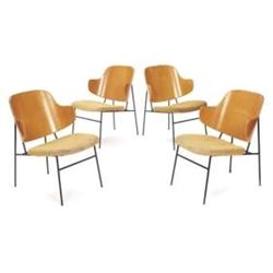 Ib Kofod-Larsen chairs, set of four, black steel frame with molded plywood backrests and upholstered seats in a black iron frame, original finish, 21.75”w x 23.75”d x 28.75”h, some wear, new upholstery needed, good condition