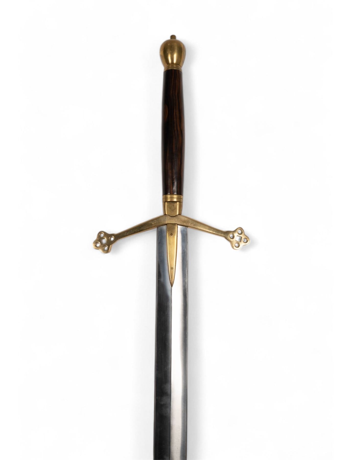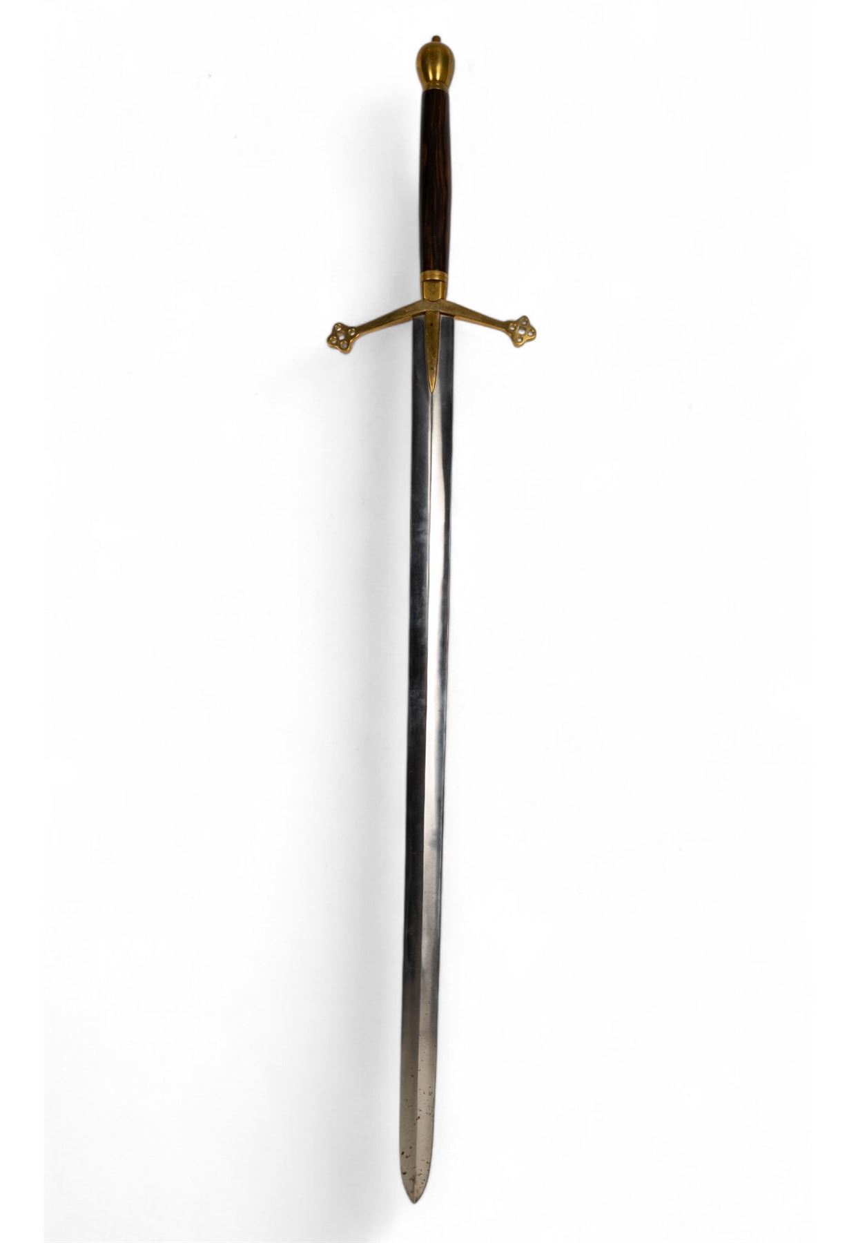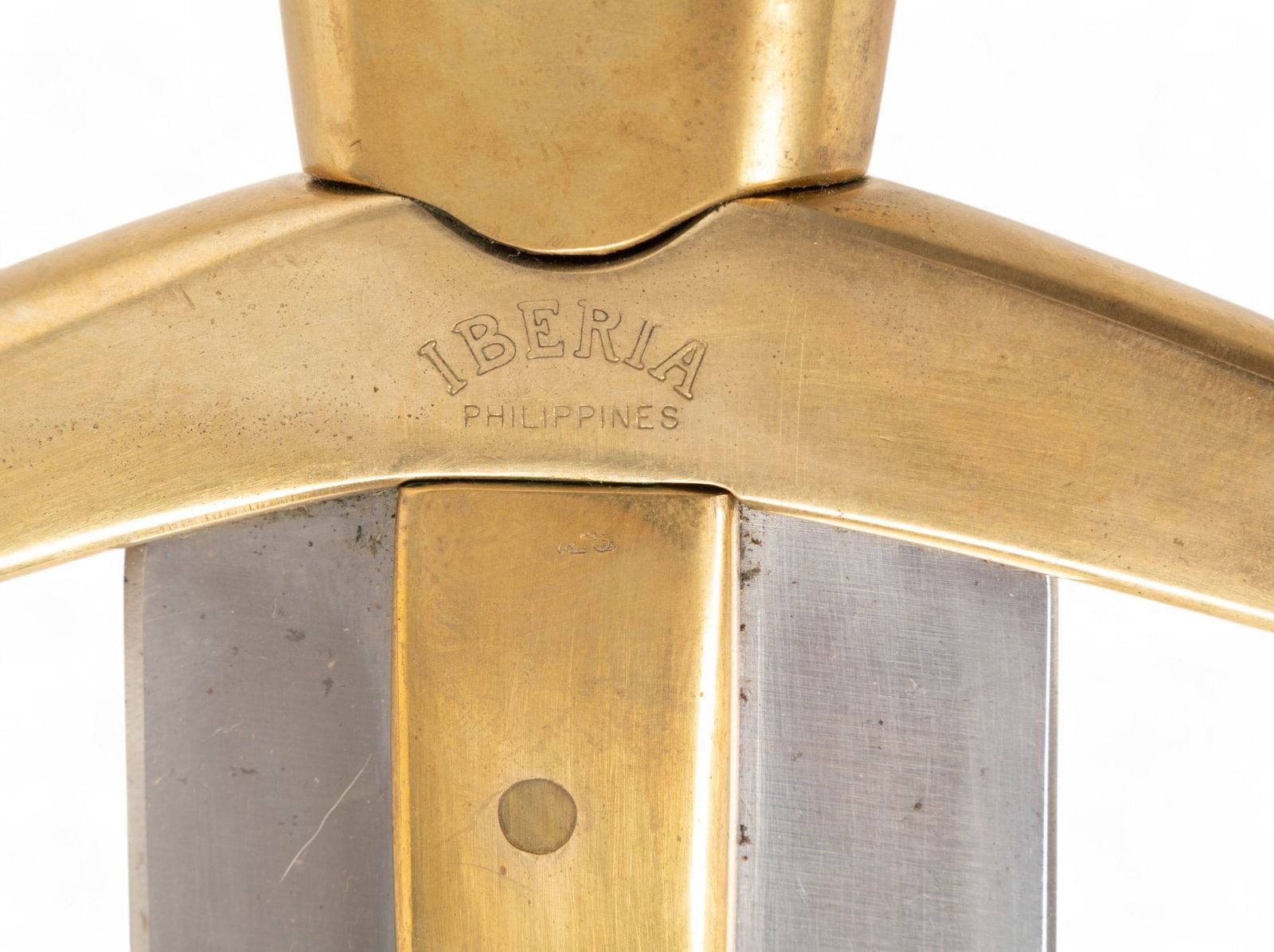 Iberia Claymore sword. Approx 42" double edge blade. Brass cross guard and pommel. Wood grip. Marked on cross guard "Iberia - Phillipines" Approx 55 1/2" overall.