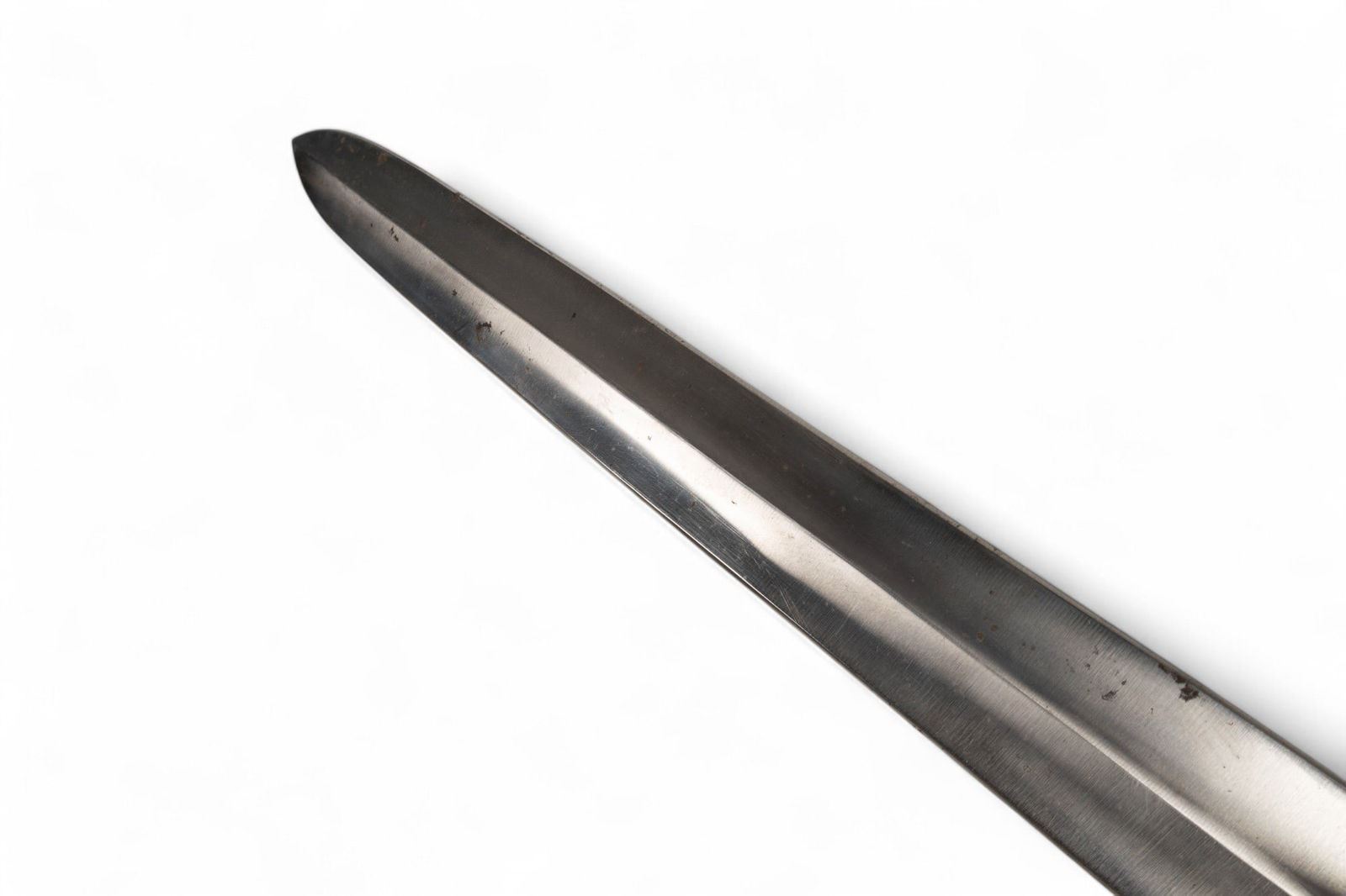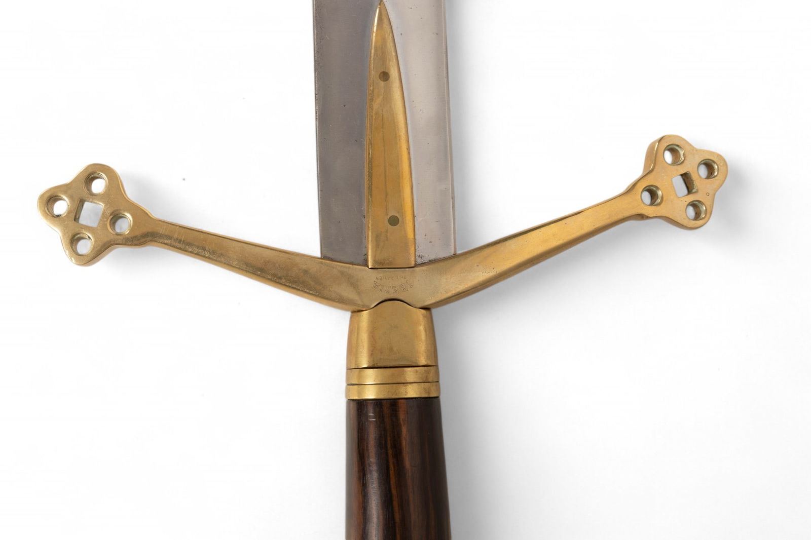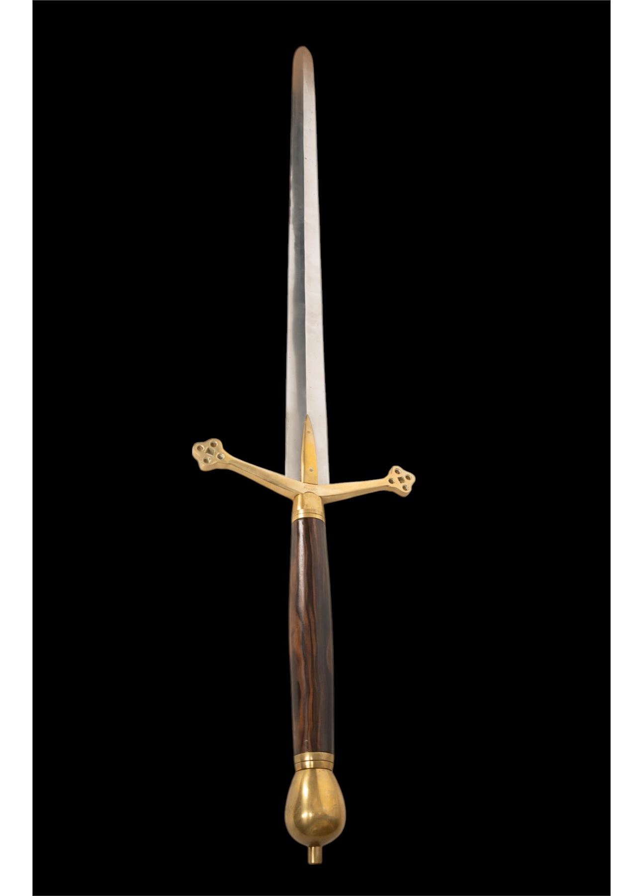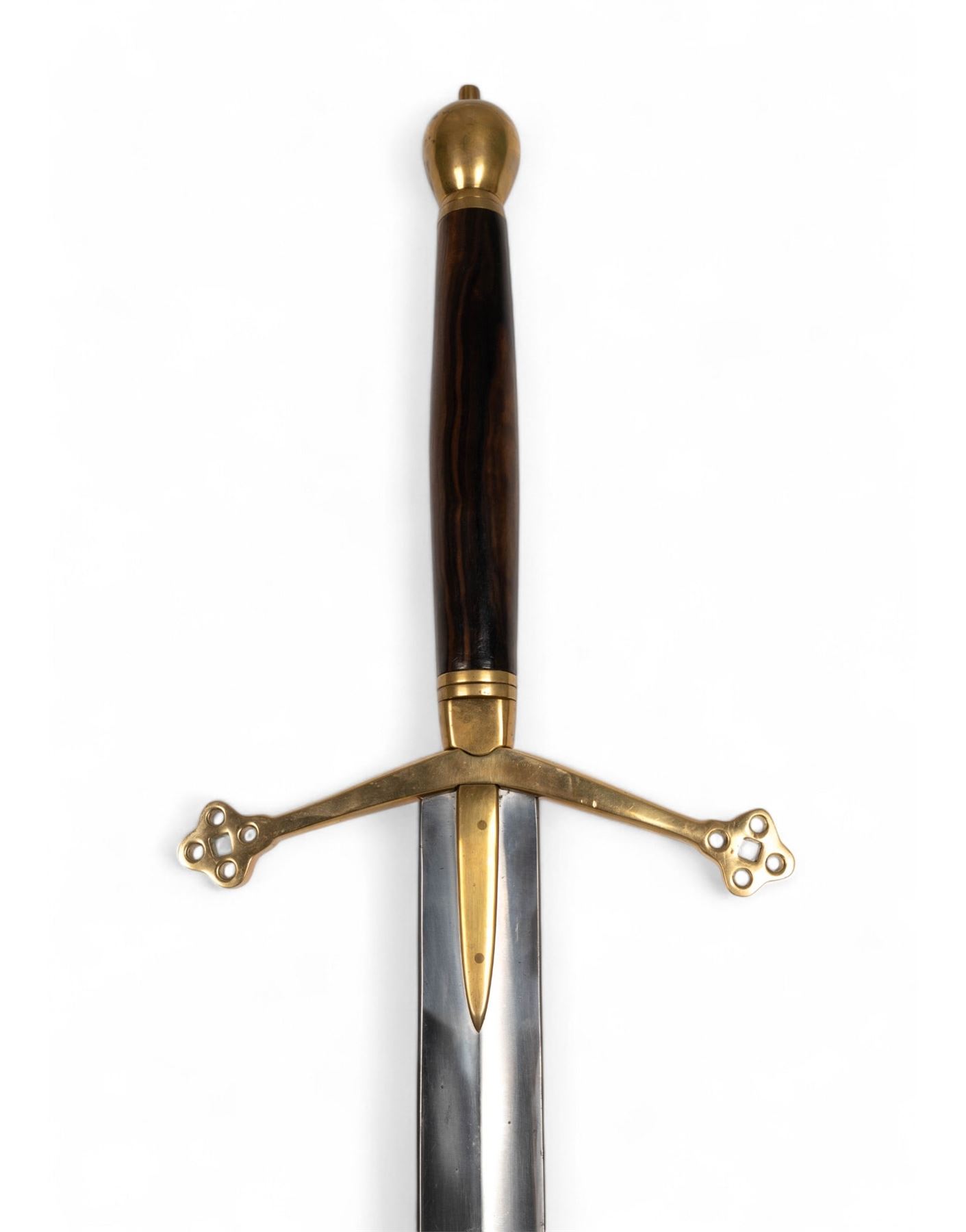 Iberia Claymore sword. Approx 42" double edge blade. Brass cross guard and pommel. Wood grip. Marked on cross guard "Iberia - Phillipines" Approx 55 1/2" overall.
