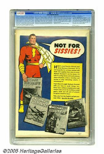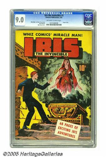 <B>Ibis The Invincible #1 (Fawcett, 1943) CGC VF/NM 9.0 Off-white to white pages.</B></I> Graceful figures and outstanding draftsmanship are two Mac Raboy trademarks, and they're showcased superbly on this cover. While Ibis' series only went on to a six-issue run, he's one of Fawcett's more enduring characters, as a longtime standby in the pages of <B>Whiz Comics</B></I>. This issue also has the art of none other than Dave Berg, drawing the adventure of Sir Butch, a fella from Brooklyn who goes back in time (we kid you not!). Overstreet 2005 VF/NM 9.0 value = $2,072; NM- 9.2 value = $2,800. CGC census 3/05: 1 in 9.0, 1 higher.