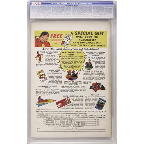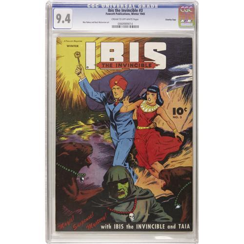 <B>Ibis The Invincible #3 Crowley Copy pedigree (Fawcett, 1943) CGC NM 9.4 Cream to off-white pages.</B></I> Mac Raboy creates a mind-numbing cover in his signature style. Rich, deep, mysterious colors befit this mystic title, <I>and</B></I> it grades two notches higher than the famed Mile High copy. This issue also has the added bonus of Basil Wolverton interior art. Overstreet 2006 NM- 9.2 value = $1,025. CGC census 10/06: 1 in 9.4, 1 higher.<BR><BR><b>Shipping:</b> Slabbed Comic (<a target="_blank" href="http://www.heritageauctions.com/common/shipping.php">view shipping information</a>)