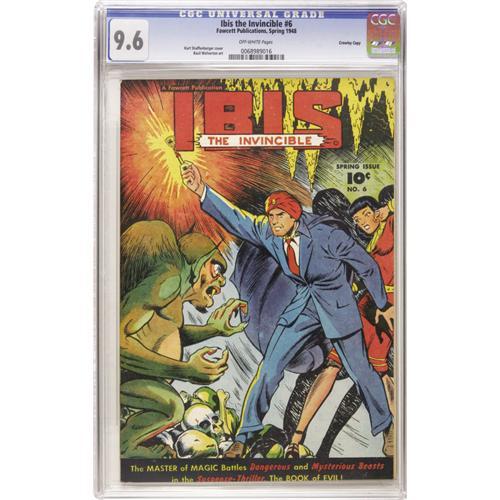 <B>Ibis The Invincible #6 Crowley Copy pedigree (Fawcett, 1948) CGC NM+ 9.6 Off-white pages.</B></I> "The Master of Magic Battles <I>Dangerous</B></I> and <I>Mysterious Beasts</B></I>" screams the tagline on this snazzy Kurt Schaffenberger cover. The interior art is by the inimitable Basil Wolverton. This is the first copy of this issue we've had the privilege to offer. Overstreet 2006 NM- 9.2 value = $650. CGC census 10/06: 1 in 9.6, none higher.<BR><BR><b>Shipping:</b> Slabbed Comic (<a target="_blank" href="http://www.heritageauctions.com/common/shipping.php">view shipping information</a>)