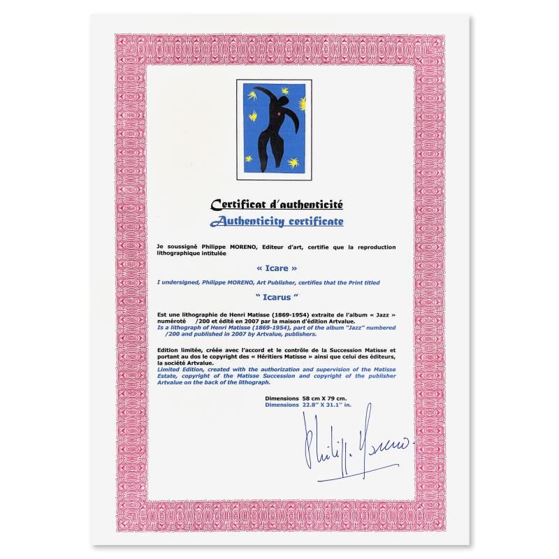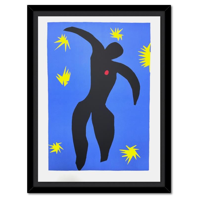 "Icare (Icarus)" is a limited edition lithograph by Henri Matisse (1869-1954). This piece comes from an edition of 200 authorized by the Matisse Estate; the edition number is not on the piece itself but on the certificate. This piece comes custom framed. Includes Certificate of Authenticity. Measures approx. 29" x 37" (frame), 23" x 31" (image).