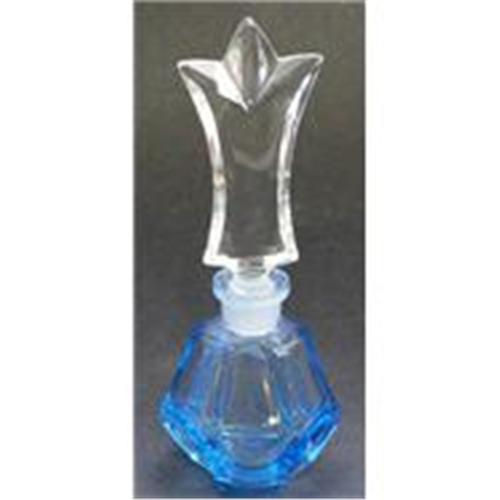 This lovely German, and so labeled, ice blue 24% lead crystal perfume bottle has a hexagonal base and a long clear lead crystal ground stopper in a beautiful and unusual shape. It measures 5 3/4 inches tall x about 2 1/4 inches wide, with the stopper alone measuring 3 3/4 inches tall. Both the bottle and its stopper are in excellent condition.