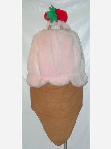 Made by New York costume designer Frankie Stein, this is a custom made ice cream cone costume. The bottom half is brown, to represent the actual cone, and the top is a sleeveless, pink piece to resemble strawberry ice cream. The topping is a pink hat, with a piece of faux-strawberry on top. Ms. Stein's work has been featured on stage, television, film & print, and she successfully owns and operates "Frankie Steinz" costume shop in New York. As a freelance costume designer, she later moved her business to New York City where her many clients include ABC, Sony, Disney and HBO, and celebrities Robert De Niro, Billy Joel and Dolly Parton, to name a few. Her work has been featured in The New York Times, Time Out magazine and People Online, and has been seen on The David Letterman Show, The View, Saturday Night Live, The Rosie O'Donnell Show, and Everybody Loves Raymond, and she is credited on the major Academy Award winning film 'Eternal Sunshine of the Spotless Mind.'