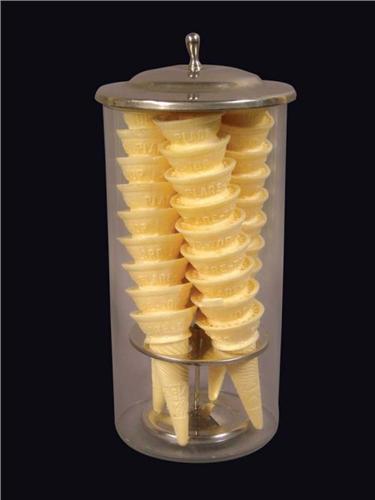 Ice Cream Cone Dispenser w/chain. Small rim chip otherwise excellent condition. 6 X 14 1/2 inches.