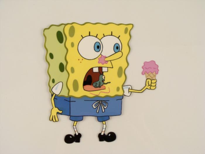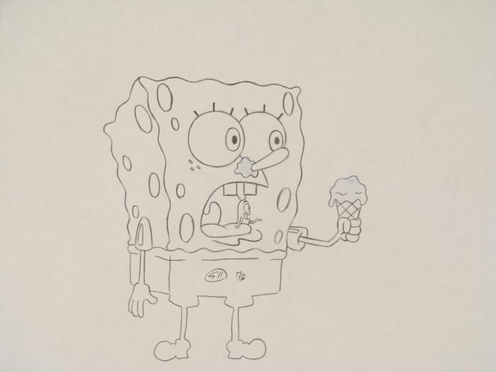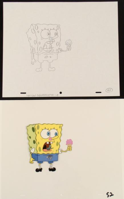 This original animation cel is from the Nickelodeon TV show SpongeBob Squarepants. The story takes place under the deep blue sea in Bikini Bottom, where SpongeBob resides. SpongeBob, who is a yellow, porous sponge, is your typical happy-go-lucky character, as he is always cheerful and enjoys making people laugh. Patrick Star, SpongeBob's neighbor who is a starfish, is your average children's show idiot, as he boasts knowing nothing and is often getting himself into ridiculous situations. Between the homes of these two lies the home of the miserable Squidward, a squid, who is known for being grouchy and playing tricks on SpongeBob and Patrick. Both SpongeBob and Squidward work at the Krusty Krab, a fast food business run by the greedy money-loving Mr. Krabs, a crab, the arch rival of the evil, possibly misunderstood, Plankton. Another neighbor, Sandy Cheeks, an athletic squirrel who normally wears an astronaut's space suit, was introduced in "Tea at the Treedome." She spends most of her time inventing and experimenting. Shown here is Spongebob with a ice cream cone.Original Production Animated Cel and Drawing Original "rough" animation drawing, in black and non-photo blue pencil, with notations in black. Overall Size of Drawing: 10 1/2" x 12 1/2" Overall Size of Cel: 10 1/2" x 12 1/2" Very Good ConditionThis is an original hand-painted cel set-up used in the production of an episode of "SpongeBob SquarePants." Each one-of-a-kind set-up represents a slight change in position of the characters. When individually photographed and projected in rapid succession, the images appear to move.