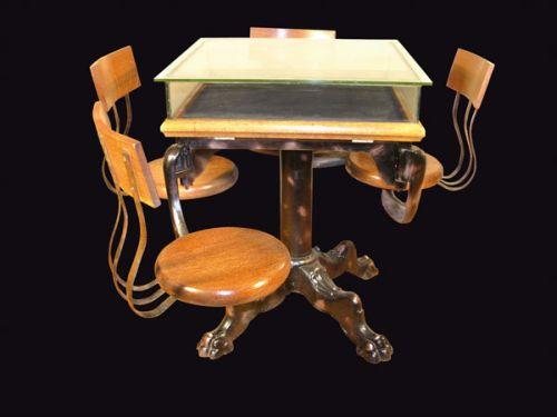 Ice Cream Glass Display Top Table, with backs on the chairs and copper flash cast base. Excellent original condition. Table top 26 inches square X 33 inches tall.