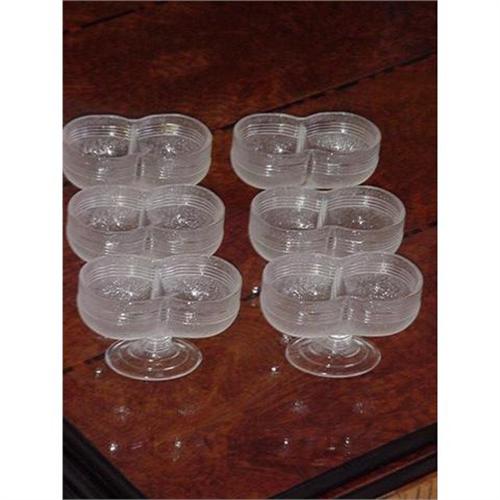 A set of six 1950's ice cream serving glasses, 5" long, 3 1/8" tall, 2" wide. The two section glass is for serving two of your favorite flavors, originally used in a diner or ice cream polar they are art deco in design and the condition of the six glasses is very good.