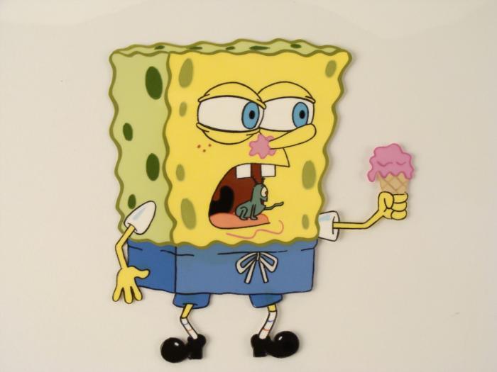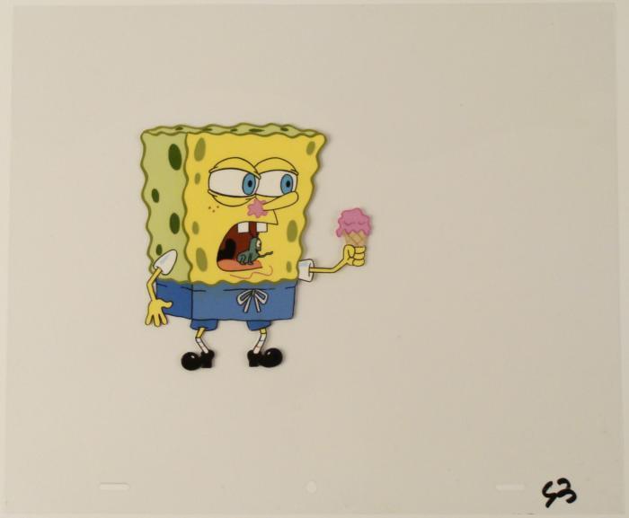 This original animation cel is from the Nickelodeon TV show SpongeBob Squarepants. The story takes place under the deep blue sea in Bikini Bottom, where SpongeBob resides. SpongeBob, who is a yellow, porous sponge, is your typical happy-go-lucky character, as he is always cheerful and enjoys making people laugh. Patrick Star, SpongeBob's neighbor who is a starfish, is your average children's show idiot, as he boasts knowing nothing and is often getting himself into ridiculous situations. Between the homes of these two lies the home of the miserable Squidward, a squid, who is known for being grouchy and playing tricks on SpongeBob and Patrick. Both SpongeBob and Squidward work at the Krusty Krab, a fast food business run by the greedy money-loving Mr. Krabs, a crab, the arch rival of the evil, possibly misunderstood, Plankton. Another neighbor, Sandy Cheeks, an athletic squirrel who normally wears an astronaut's space suit, was introduced in "Tea at the Treedome." She spends most of her time inventing and experimenting. SpongeBob has ice cream on his nose.Original Production Animated Cel Overall Size of Cel: 10 1/2" x 12 1/2" Very Good ConditionThis is an original hand-painted cel set-up used in the production of an episode of "SpongeBob SquarePants." Each one-of-a-kind set-up represents a slight change in position of the characters. When individually photographed and projected in rapid succession, the images appear to move.