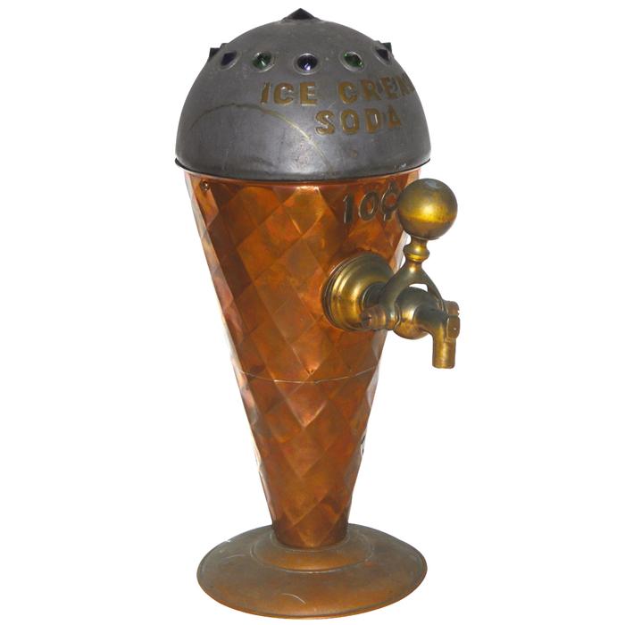 Ice Cream Soda lighted 10 Cent display cone w/spigot, formed copper cone w/jeweled dome, embossed metal reads Ice Cream Soda, stamped I.C.S. Co. on rear, a very unusual & Very Rare figural display in Exc orig cond, 21"H.