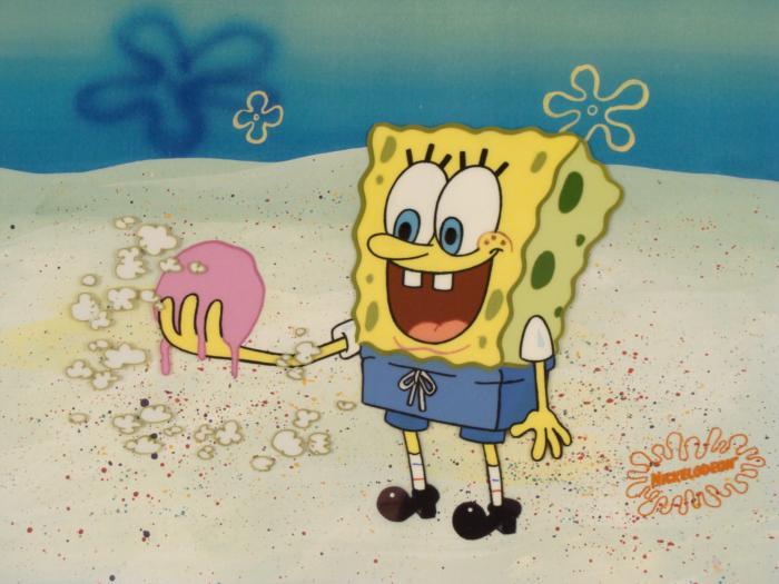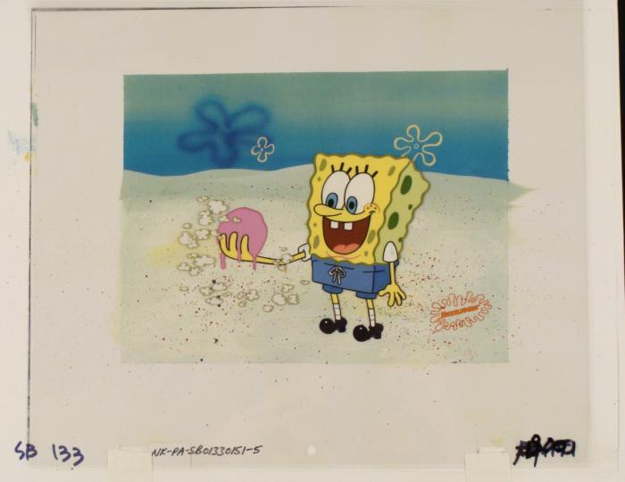 This animation cel and reproduction background are from the Nickelodeon TV show SpongeBob Squarepants. The story takes place under the deep blue sea in Bikini Bottom, where SpongeBob resides. SpongeBob, who is a yellow, porous sponge, is your typical happy-go-lucky character, as he is always cheerful and enjoys making people laugh. Patrick Star, SpongeBob's neighbor who is a starfish, is your average children's show idiot, as he boasts knowing nothing and is often getting himself into ridiculous situations. Between the homes of these two lies the home of the miserable Squidward, a squid, who is known for being grouchy and playing tricks on SpongeBob and Patrick. Both SpongeBob and Squidward work at the Krusty Krab, a fast food business run by the greedy money-loving Mr. Krabs, a crab, the arch rival of the evil, possibly misunderstood, Plankton. Another neighbor, Sandy Cheeks, an athletic squirrel who normally wears an astronaut's space suit, was introduced in "Tea at the Treedome." She spends most of her time inventing and experimenting. SpongeBob took the sand off the ice cream.Original Printed Background and Animated Cel Overall Size of Background: 10 1/2" x 14 1/2" Overall Size of the Cel: 10 1/2" x 12 1/2" Very good condition This is an original hand-painted cel set-up used in the production of an episode of "SpongeBob SquarePants." Each one-of-a-kind set-up represents a slight change in position of the characters. When individually photographed and projected in rapid succession, the images appear to move.