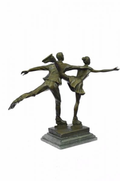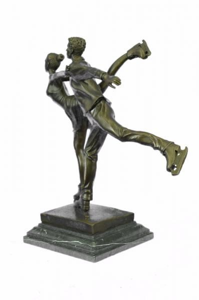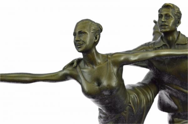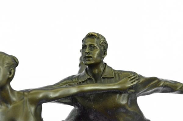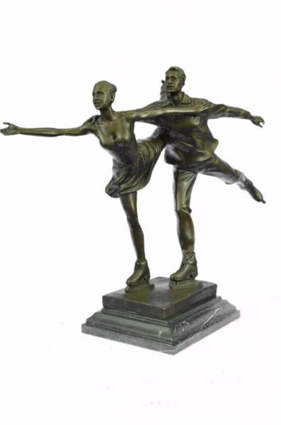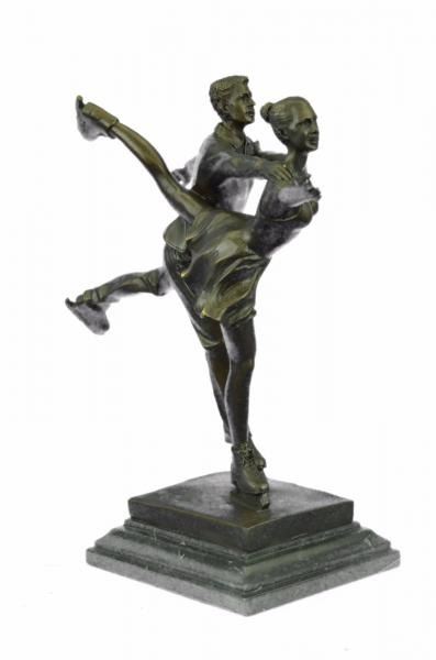 Skating has been entertaining winter game lovers for ages. Pair’s skaters perform elements such as acrobatic lifts that are unique to pair skating, all the while moving in perfect unison. Pair skating is difficult because achieving this degree of unison requires similar technique and timing on all elements of the performance, as well as ultimate trust between the partners. This Sculpture was cast using the Lost Wax Method and has a brown patina and is mounted on a marble base. Bronze Dimensions with Marble Base: Height 14 X Width 18 inches. Weight: 14 LBS.