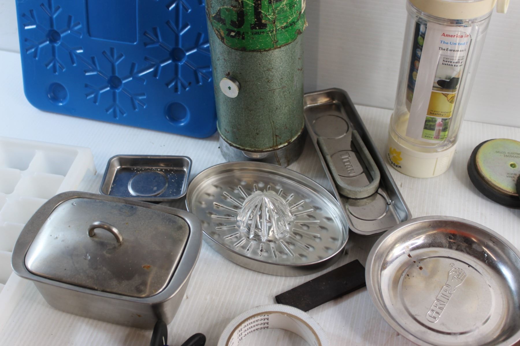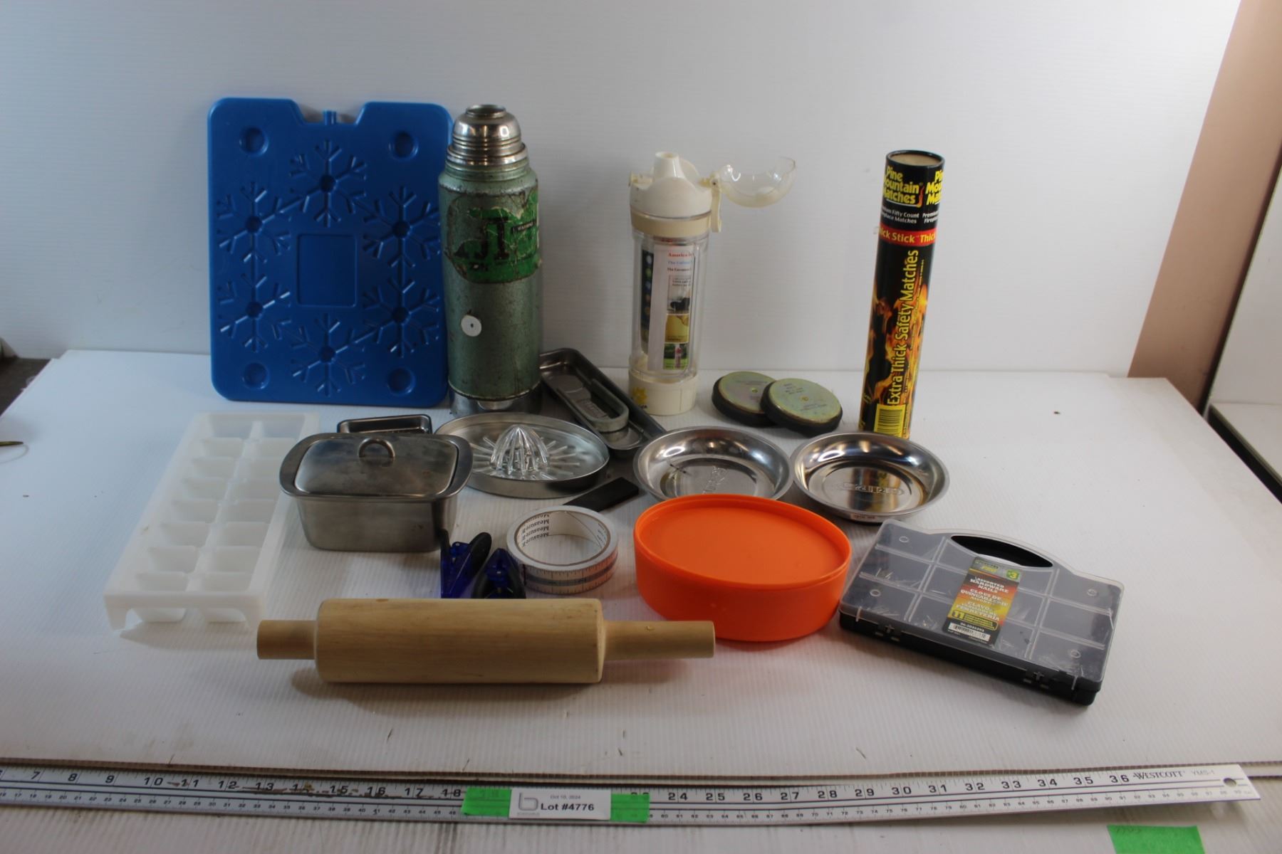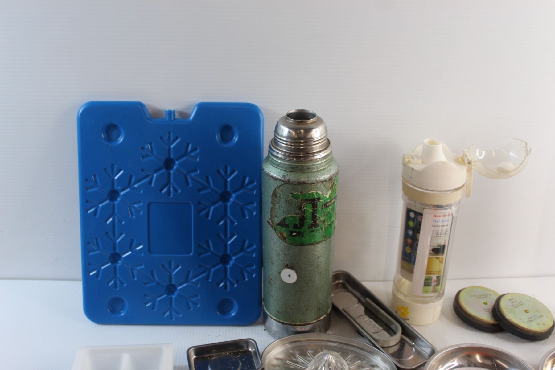 Ice Tray, Thermos, Magnets, Nails, Hand Juicer. Cold Pack and Assorted Items