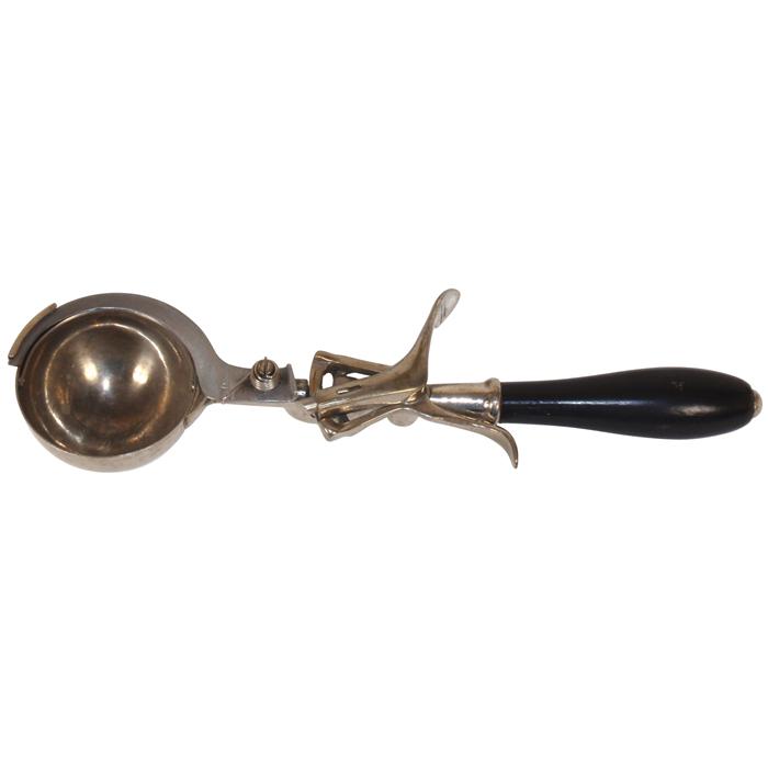 Ice cream scoop, Dover "Slicer", nickel-plated brass w/wood handle, slicer cuts off excess ice cream, bowl size 10, c.1924, Exc cond. 11"L.