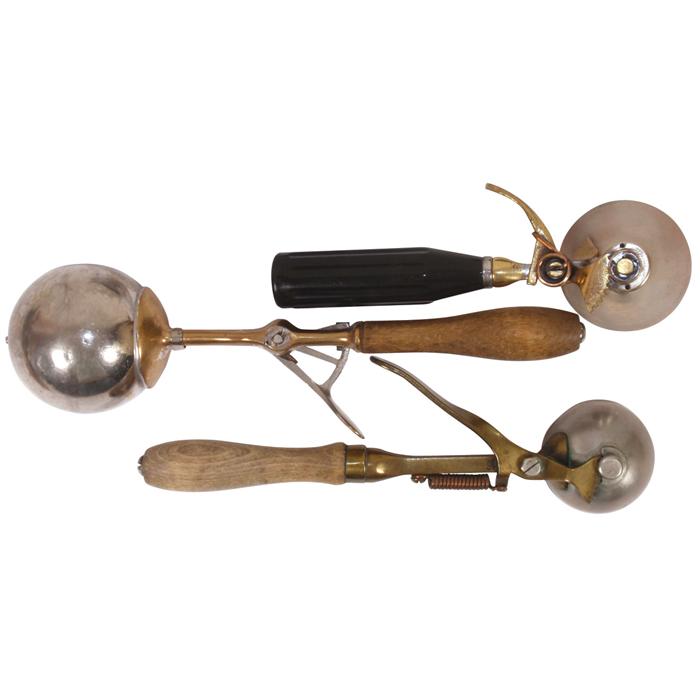 Ice cream scoops (3), Indestructo conical bowl size 10 w/Bakelite handle, Indestructo #3 round bowl size 16 & Gilchrist #31 round bowl size 6, all in VG cond, 8.25" to 11.25"L.