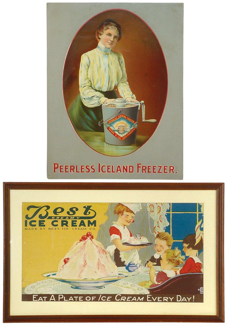Ice cream signs (2), Best Ice Cream litho on cdbd, shows children eating ice cream, VG cond, matted & framed, 15"H x 24.5"W & Peerless Iceland Freezer litho on metal over wood, silver border has been repainted, o/wise in VG cond, 19.5"H x 13.5"W.